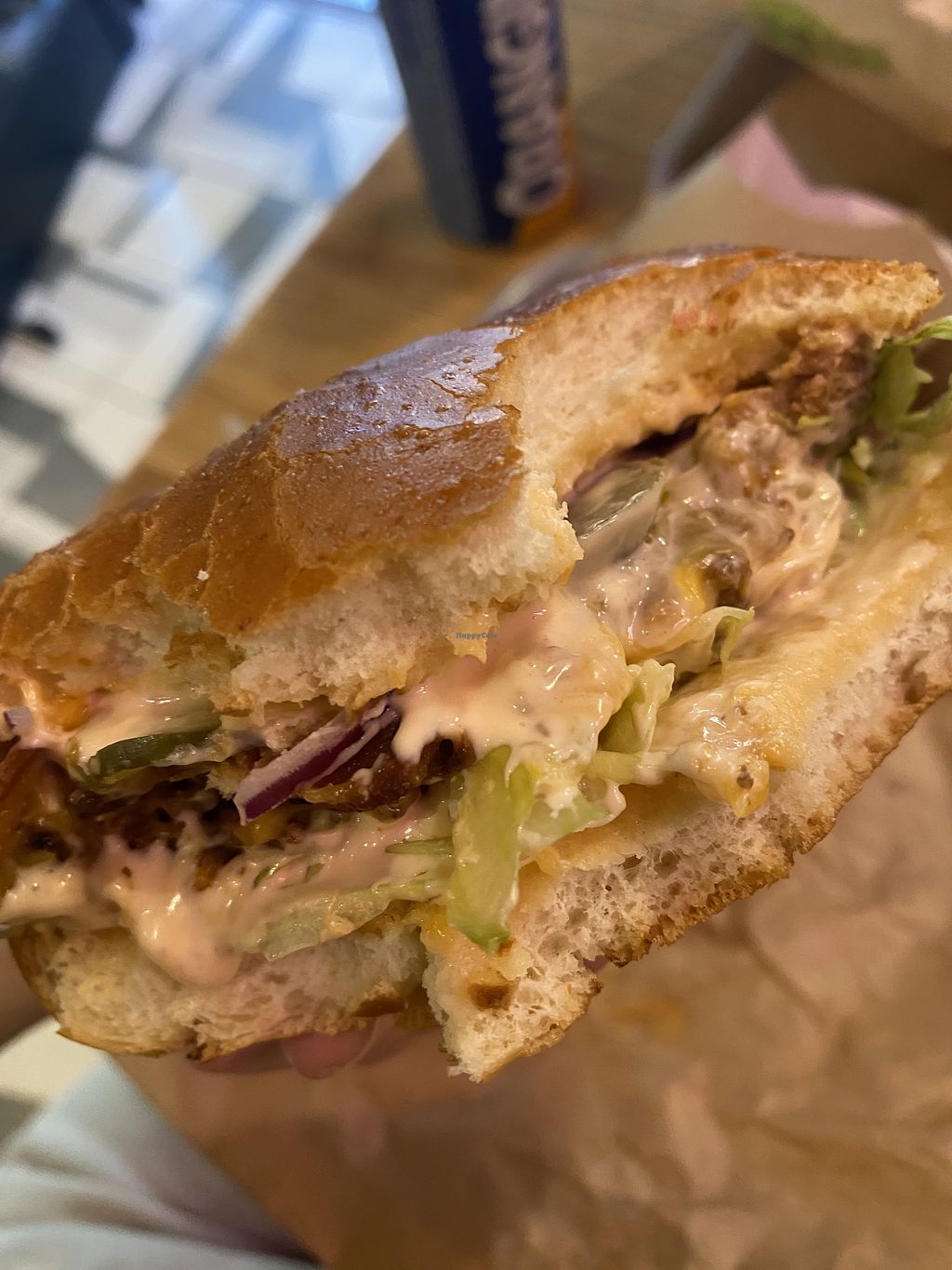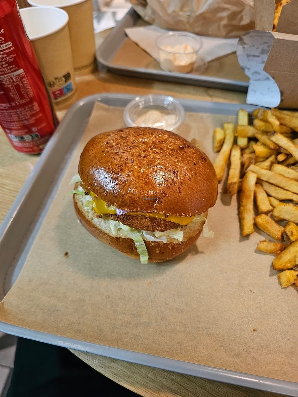 Der vegane Chicken Burger war richtig stark und auf den Punkt. Mein Kollege war total überrascht vom „Bacon“ auf seinem Burger und meinte sogar, das sei besser als echtes. Preis und Portionen sind fair, das Essen hat klar 5-Sterne-Potenzial. Der Coleslaw war mir etwas zu mild und ein bisschen mehr Würze wäre gut. Ein kleiner Abzug, weil der Laden selbst etwas klebrig wirkte. Trotzdem klare Empfehlung – wir würden wieder hingehen.