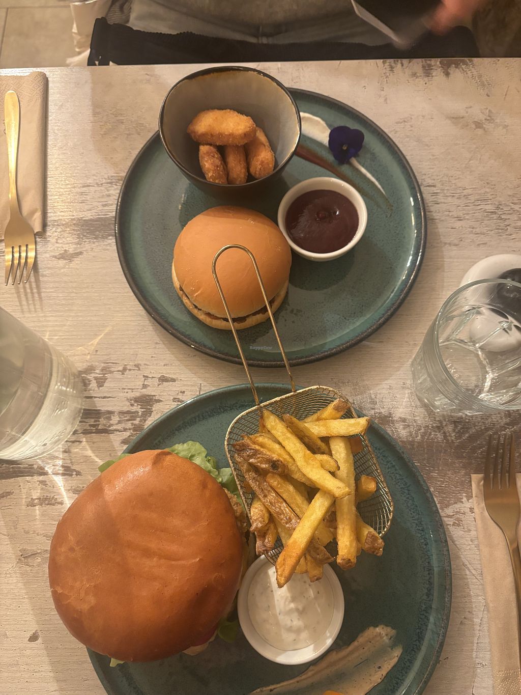 Cozy place offering burgers, sides like fries or 'mozzarella' sticks and changing desserts. Everything is aesthetically served, tastes great and is completely vegan. The waiter was incredibly kind as well.