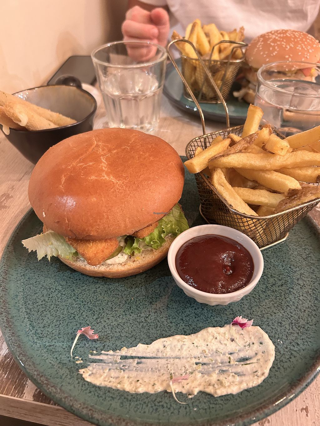 EVERYTHING was delicious, i don't like pickles but enjoyed their's so much, the cheese sticks were beyond delicious and everything felt fresh, the hamburguer bun was soft and fluffy and the filet no fish was incredibly similar to fish texture. The dessert was perfect. The presentation was beautiful and the service great. Great music choice and clean place. Close to the tram station.