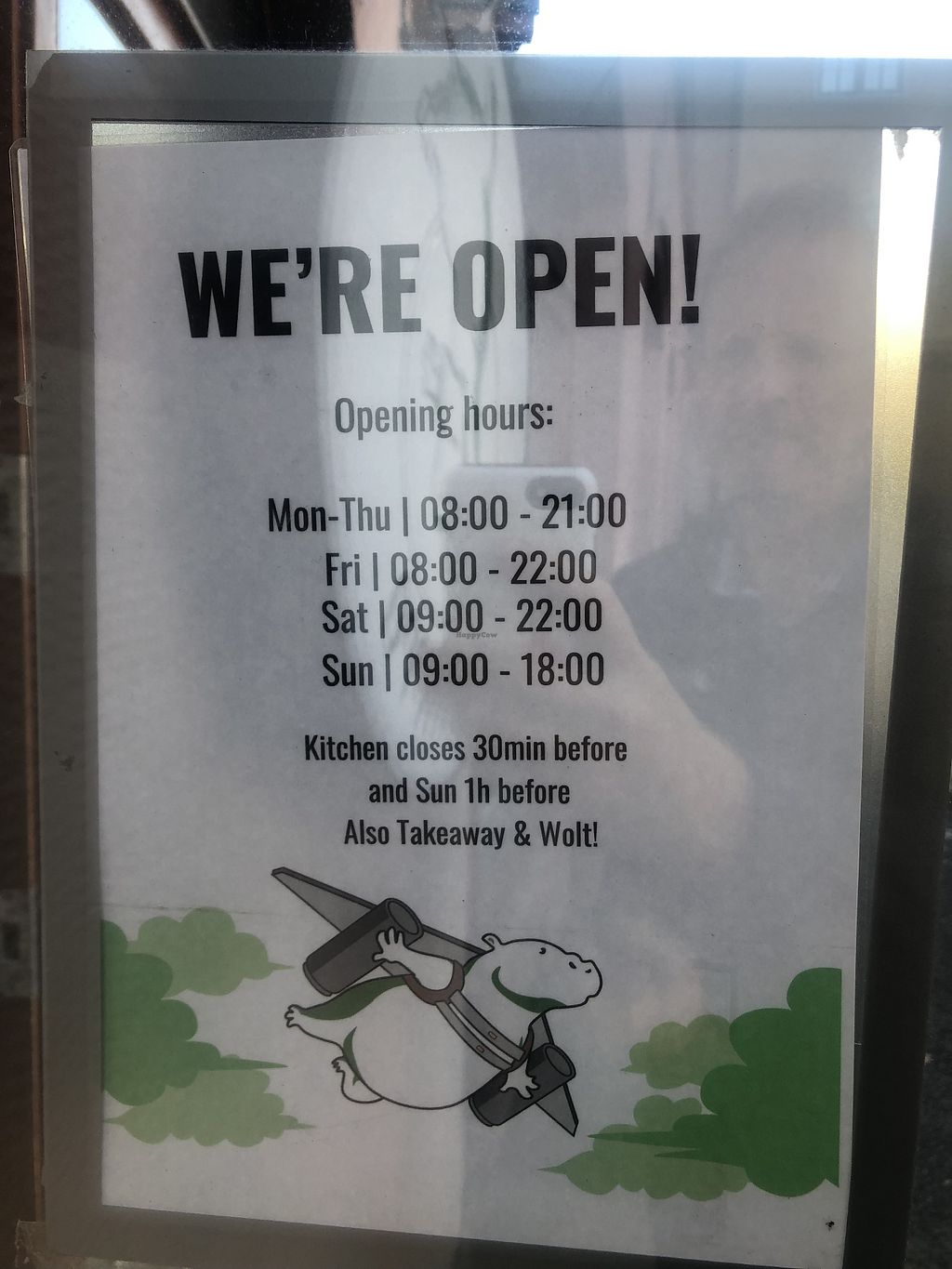 Serves meat, vegan options available. European cafe with vegan choices. Menu is clearly labeled and includes smoothie bowls, banana pancakes, avocado pasta, quinoa buddha bowl, toast and more. Oat milk available for hot beverages Open Mon-Thu 08:00-21:00, Fri 08:00-22:00, Sat 09:00-22:00. Closed Sun.