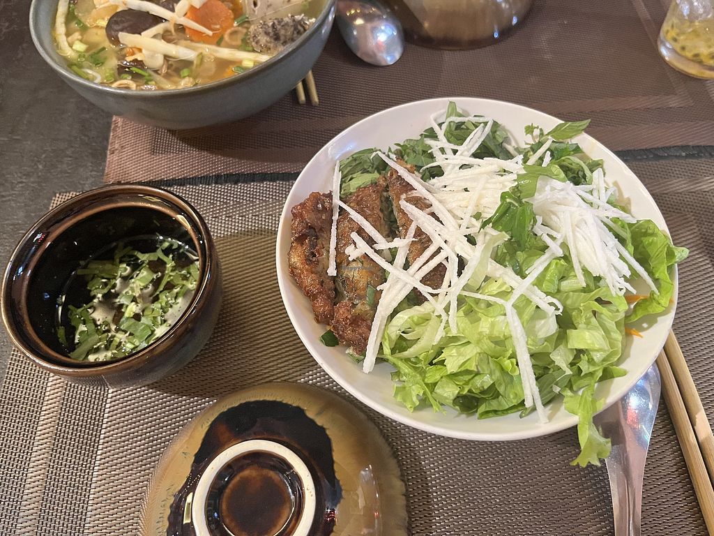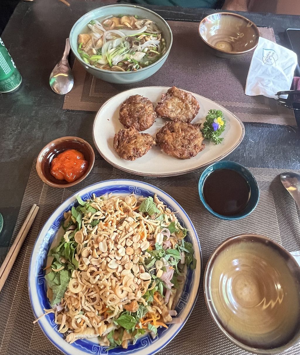 Beautiful meal we had the Green Inn Pho, fresh spring rolls, fresh lime juice, and incredible vegan chocolate ice cream 🍦 which I highly recommend. Beautiful venue with a calm atmosphere.