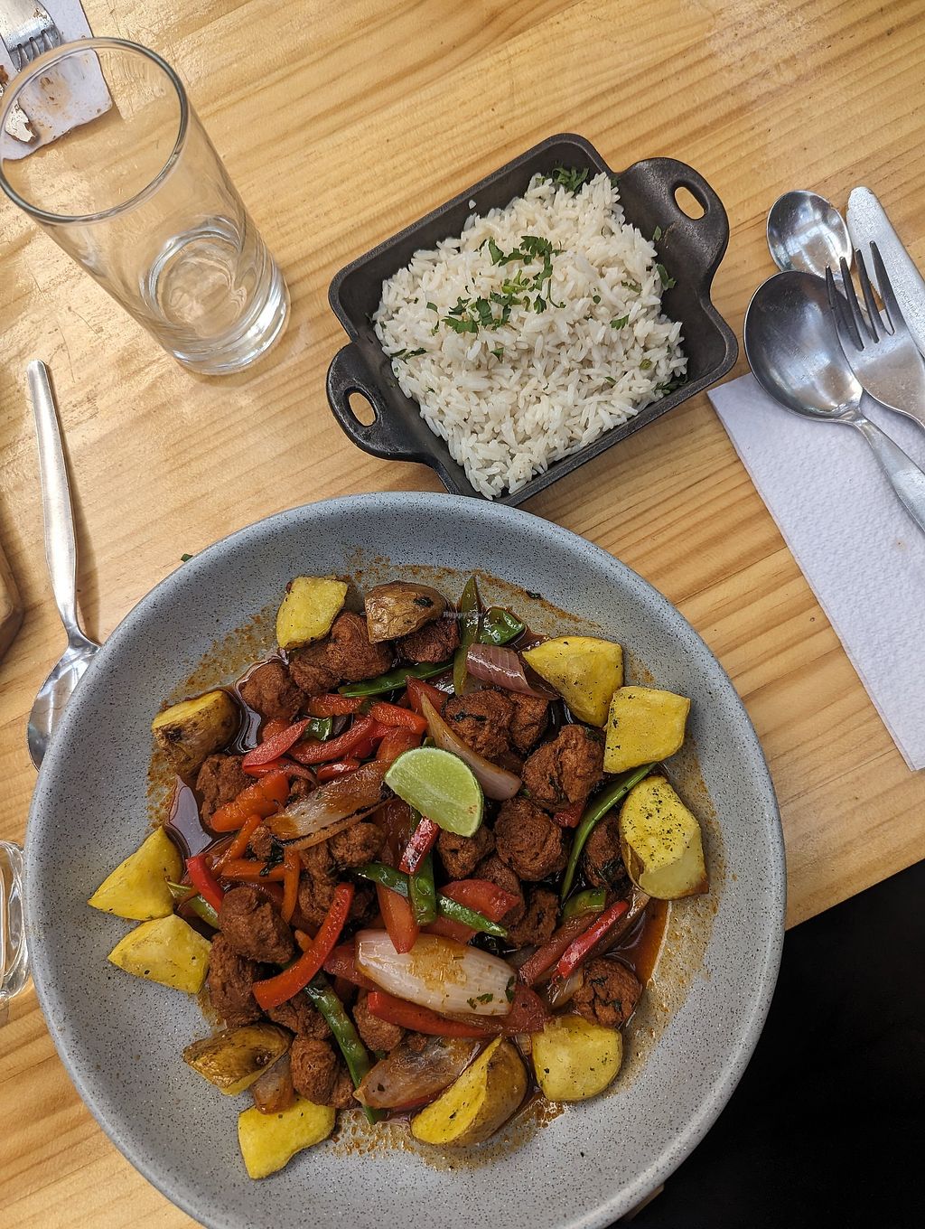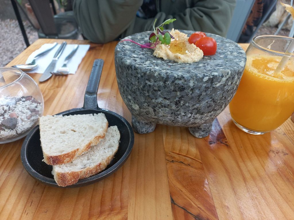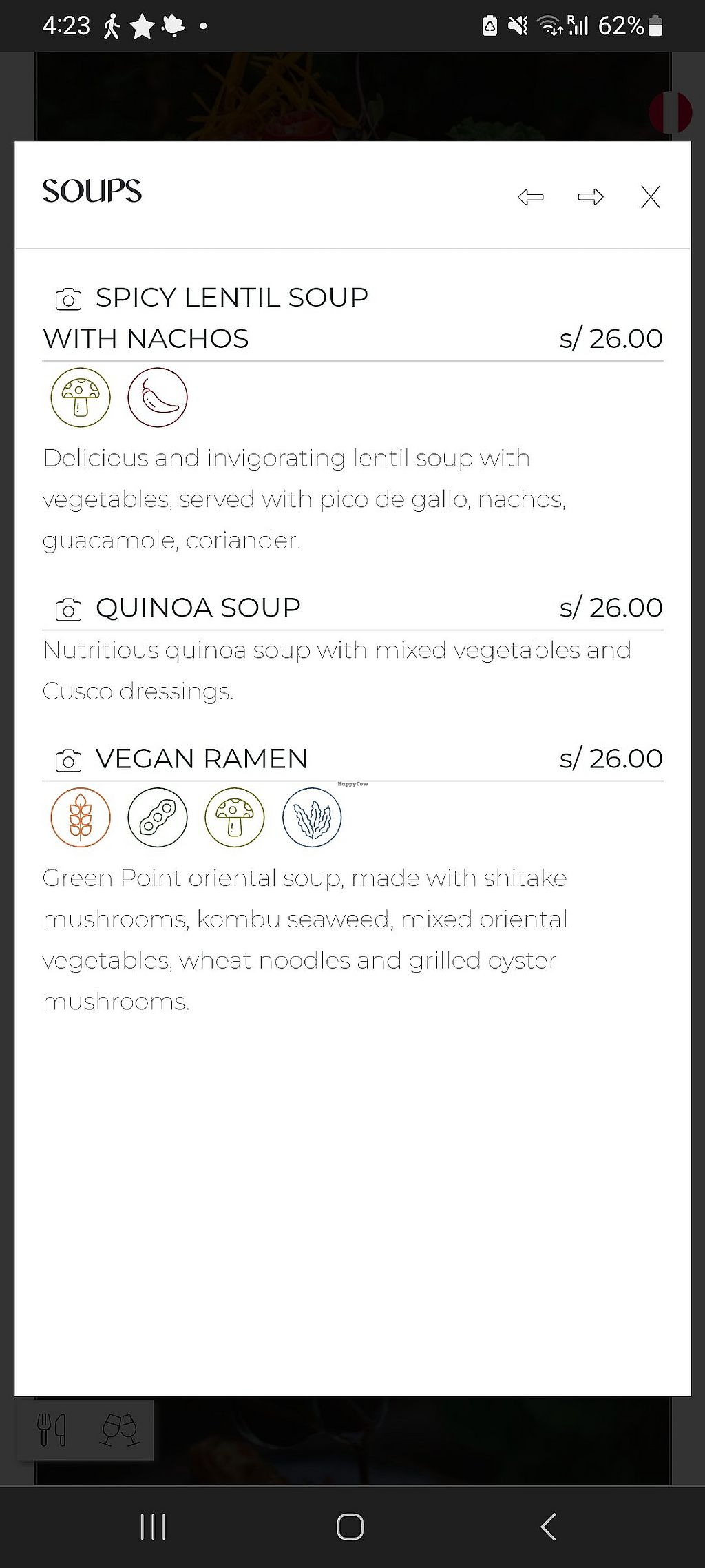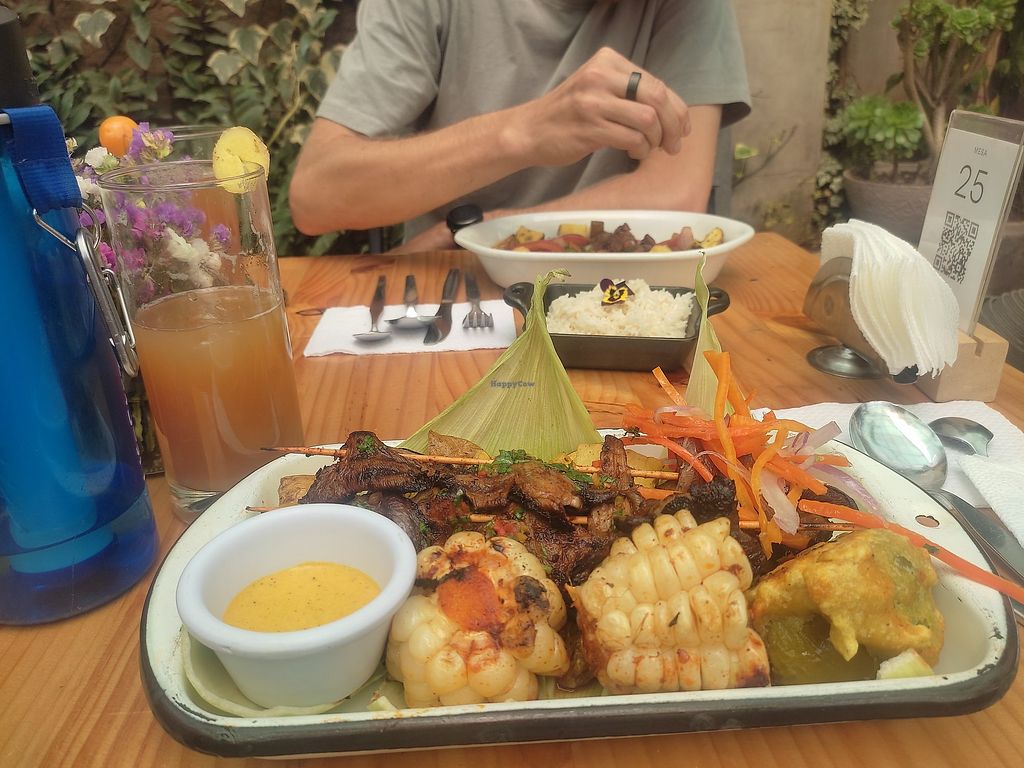 We ordered three different dishes: spicy lentil soup, cuczo parrilla and tacu tacu. Overall we were pretty disappointed with all of them, we thought the flavours weren't that great - we thought it was quite simple and bland. Especially reading all the reviews on happy cow we really expected more, especially for the prices. Visually beautiful food, beautiful restaurant, great service and even a complimentary hummus and bread (hummus wasn't that nice though). Overall too much hype for something that wasn't amazing, we enjoyed the 8 soles almuerzo so much more the day before from el Olivo.