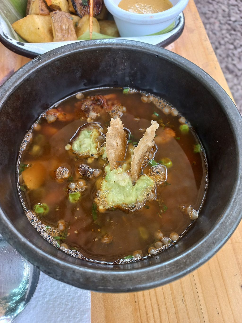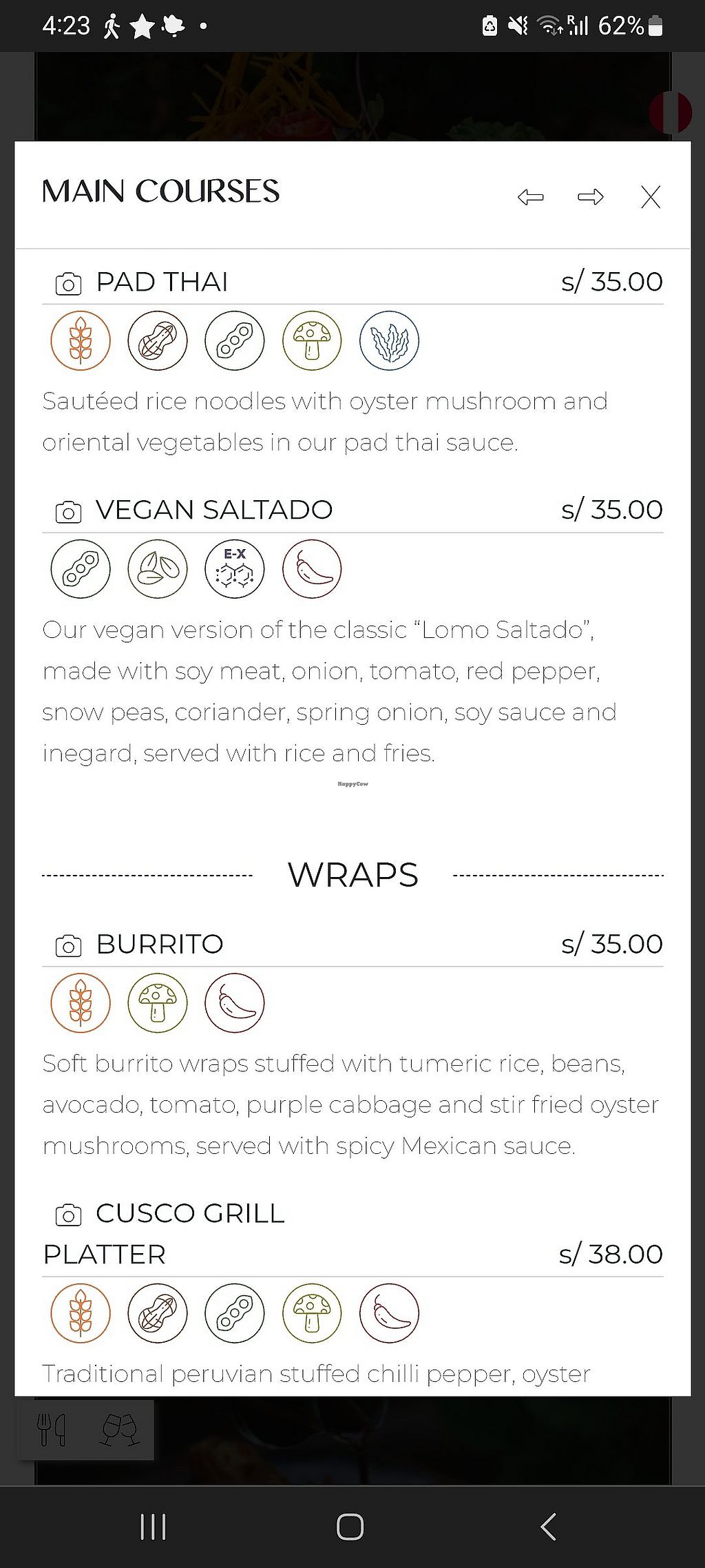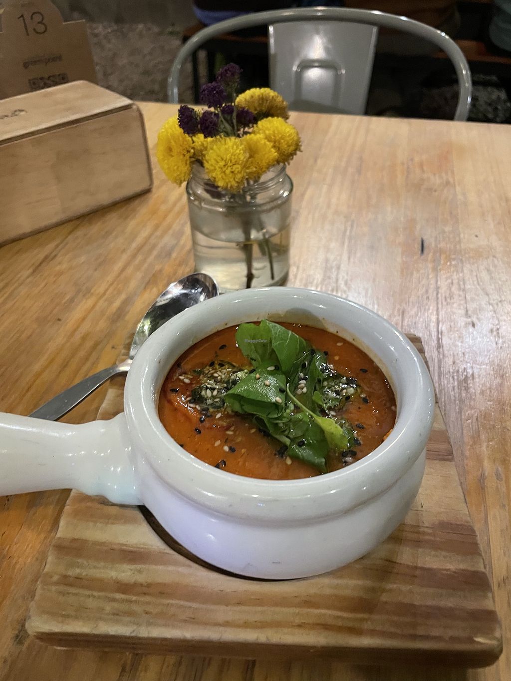 We ordered three different dishes: spicy lentil soup, cuczo parrilla and tacu tacu. Overall we were pretty disappointed with all of them, we thought the flavours weren't that great - we thought it was quite simple and bland. Especially reading all the reviews on happy cow we really expected more, especially for the prices. Visually beautiful food, beautiful restaurant, great service and even a complimentary hummus and bread (hummus wasn't that nice though). Overall too much hype for something that wasn't amazing, we enjoyed the 8 soles almuerzo so much more the day before from el Olivo.