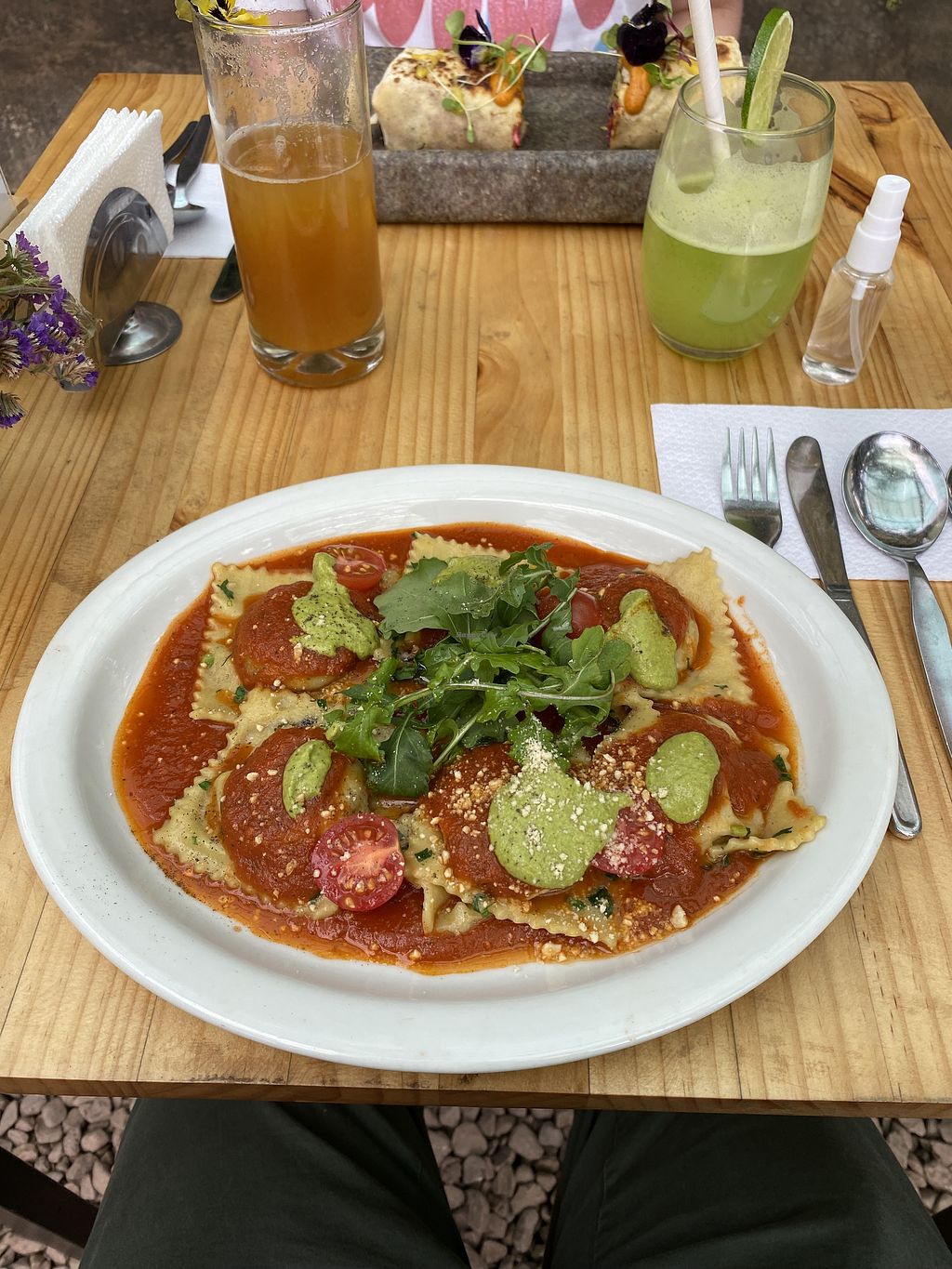 First the atmosphere is incredible, sheltered from the Cusco cold but full of plants and lit by candles. The food is expensive but delicious, definitely a bit of a splurge. The ravioli with fresh pesto was excellent. I often get delicious deserts or a vegan croissant from the bakery😍