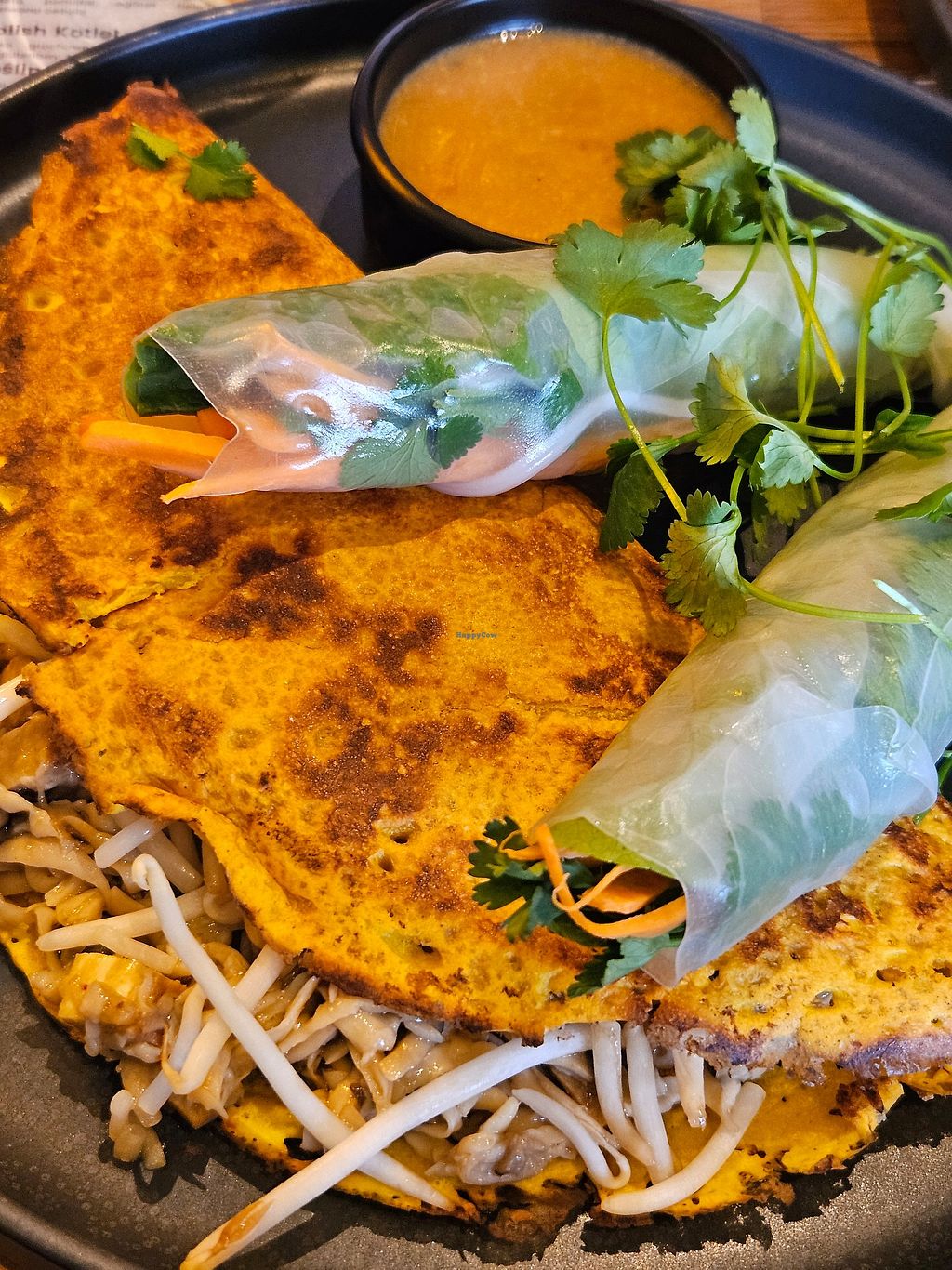 Wonderful food! We had a dish with potatoes, proteine balls, yellow beans, cole slaw and a white dill saus and a curry that had such good flavour and very crispy tofu! There were also burgers, ravioli, a Polish dish and a kids menu. Don't forget to look at the pies! They are not on the menu, but just walk inside and see. They were the best I've had in a long time! Moist, flavorfull, creamy. Onr was a Dubai chocolate pie. Their lemonade was also absolutely great. They had cosy outdoor seating with cute flowers and plants around. The man who helped us spoke a little english. For me, in a fully vegan place it doesn't matter so much.