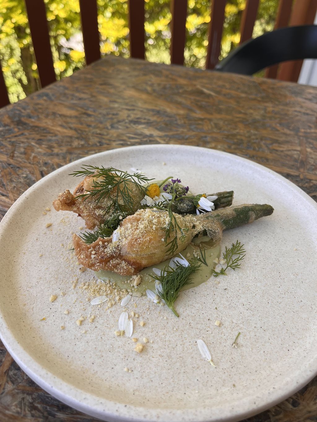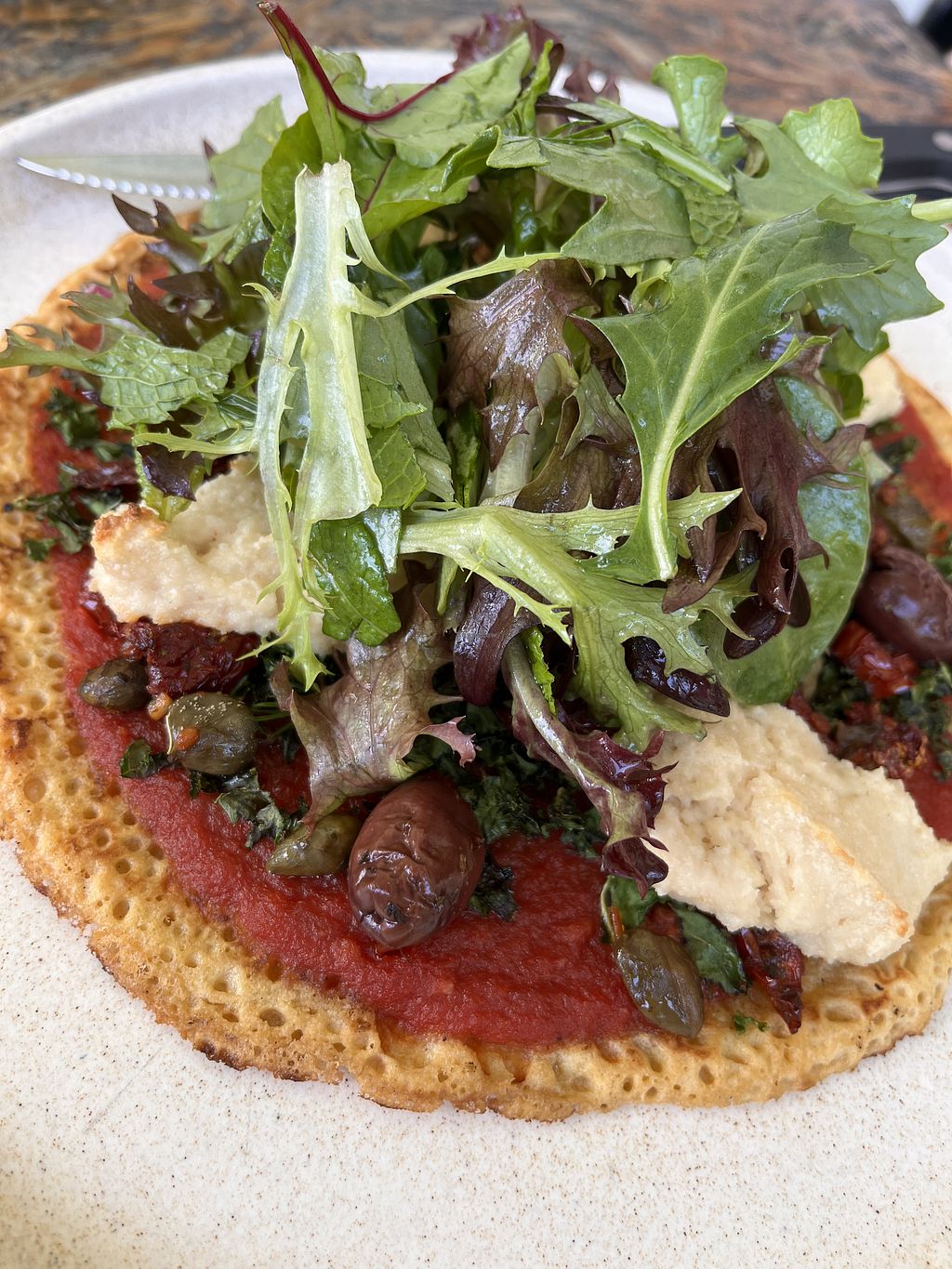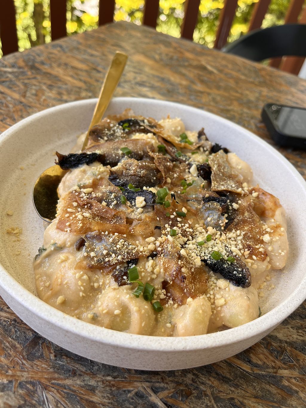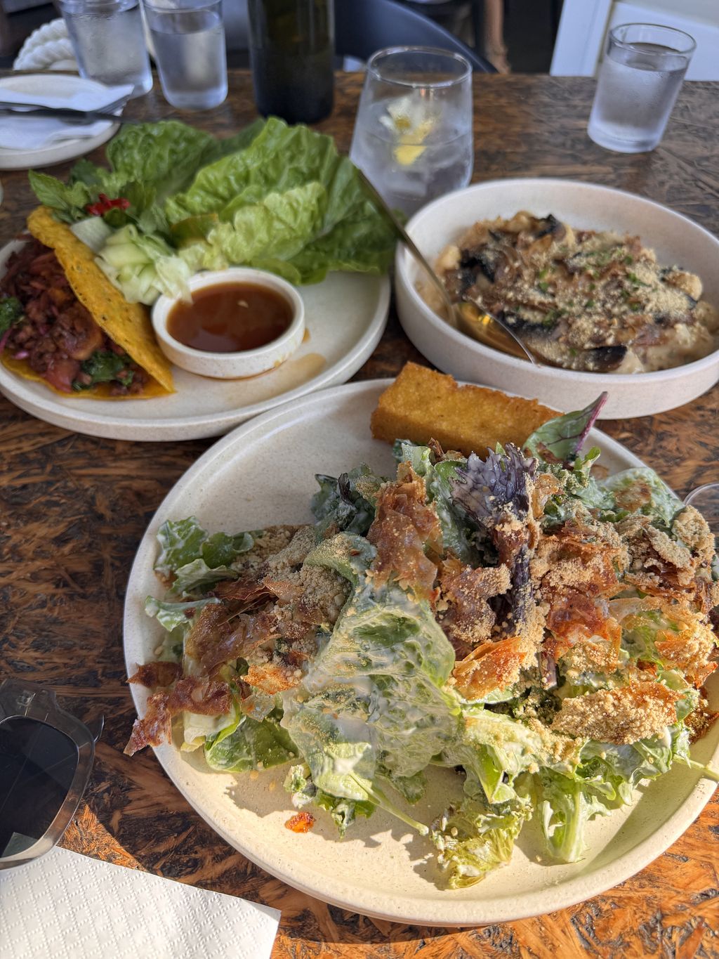 My kale caesar salad, friends dishes- Vietnamese pancake and gnocchi. …