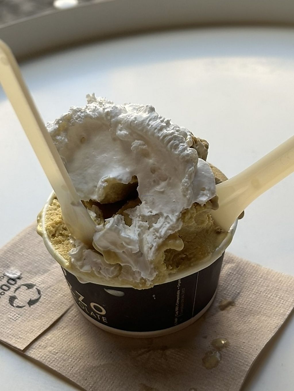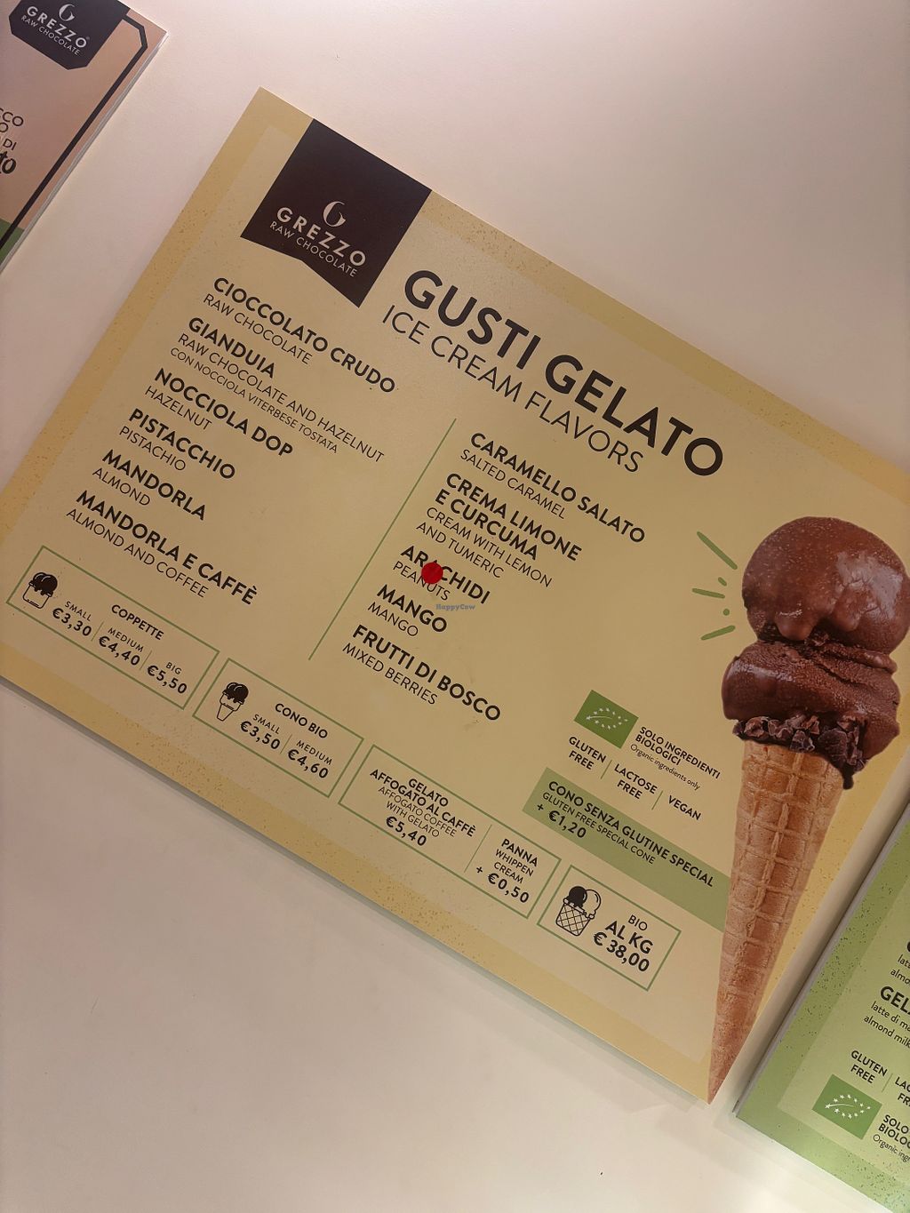 Read moreInteresting flavors, my favorite was the lemon and tumeric which was really soft and refreshing. The almond and coffee was also incredibly good. The cone was the best we've had so far in Italy, especially as it's dipped in that raw chocolate.