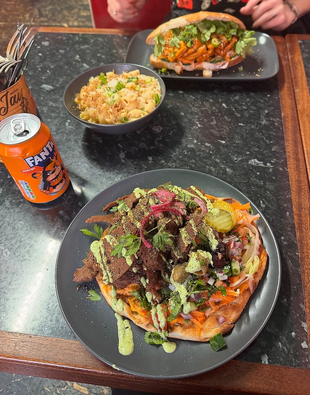 The menu had a bit of variety - we had a shawarma kebab, Manh Mi and macaroni cheese, plus Snickers cheesecake. All were delicious. It was quiet when we went (1:30pm on a Saturday) which was good for us as we were served quickly but obviously less good for the owners. There were three others tables of people and it could have fitted many more. The vibe is chill punk which we liked. Service was friendly and quick. We really enjoyed it here and would definitely come back again.