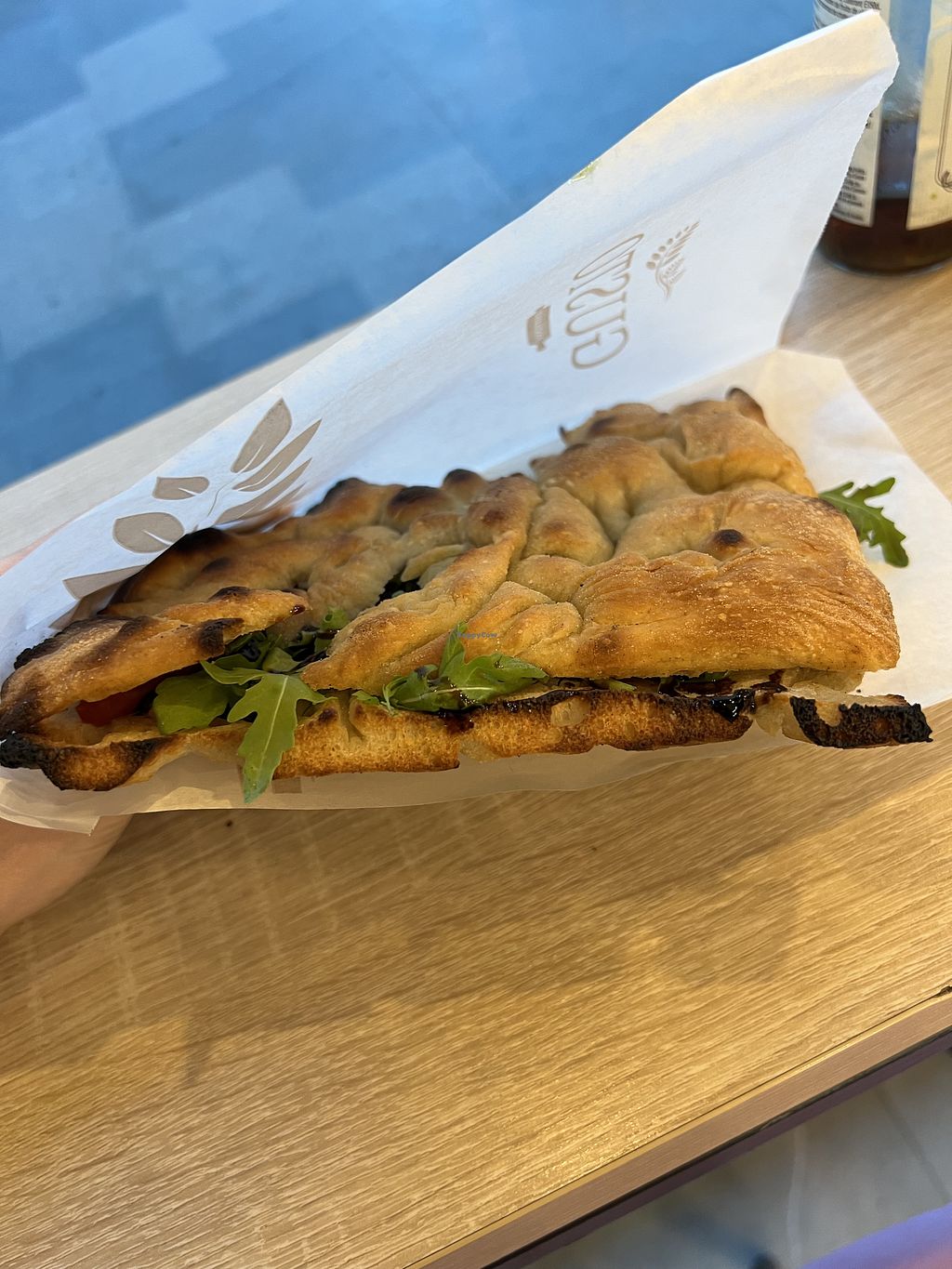 Serves meat, vegan options available. Small focaccia takeout shop with limited seating. Offers customizable vegan focaccia sandwiches with choice of toppings like vegetables, tomatoes, mushrooms and olive cream. Open Mon-Sat 11:30-22:30. Closed Sun.