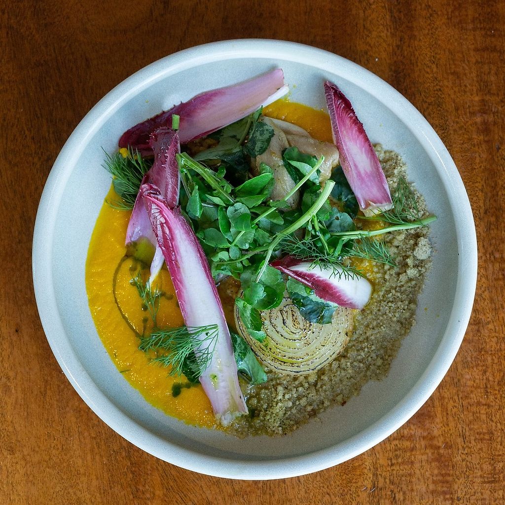 Italian with a twist: beet polenta with roasted veg, root celery puree…