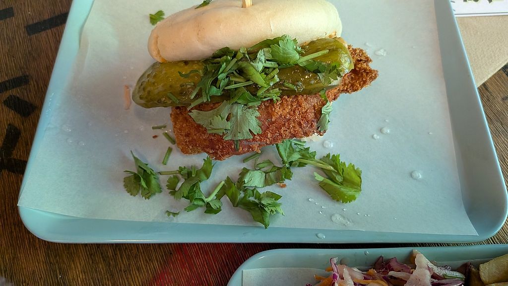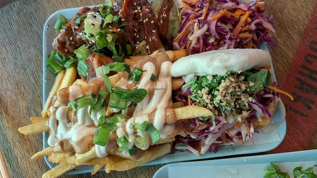 Serves meat, vegan options available. Asian restaurant with vegan choices. Menu includes seitan & chives and lemongrass shiitake dumplings; tofu, shiitake and vegan fried chicken baos, cole slaw and fries.Vegan items are clearly labeled, including sauces. Open Wed 17:00-21:00, Thu-Sun 12:00-21:00.