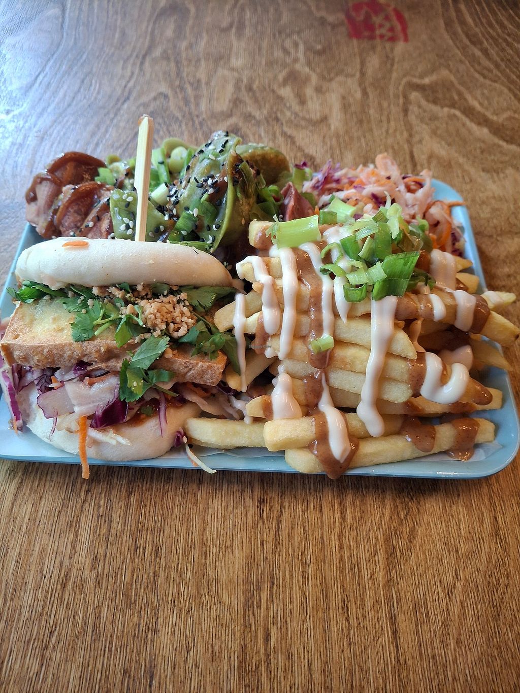 We had the two types of vegan dumplings and one of the three vegan bao buns, plus they gave us free fries! Everything was super tasty and the prices were very reasonable. Also the service was fast (place wasn't very busy when we came). The outdoor seating isn't very suitable for adults, more for 5-year-olds, so we got takeout and sat in the nearby park instead (the indoor seating looked fine though). Note that the staff didn't seem to speak German (which was fine for us but for locals who don't speak English this may not be ideal).