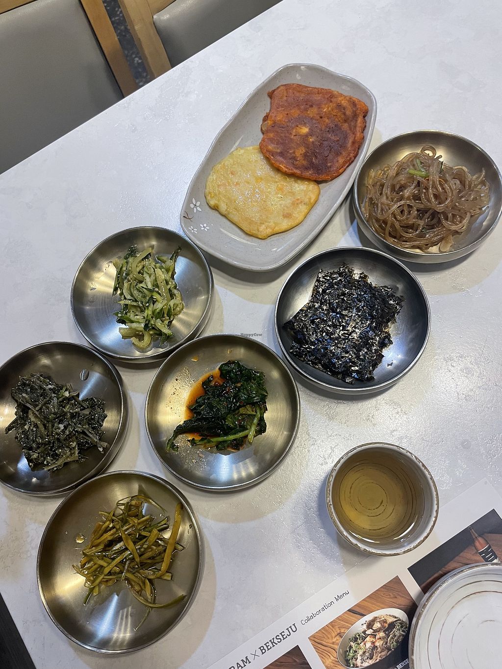 Inside the main menu is a menu for vegan & halal. When you get the side dishes when you sit down the kimchi, Japchae, a chicken dish and gochugang is taken away but the rest is left. Staff understood what vegan is. So much food!