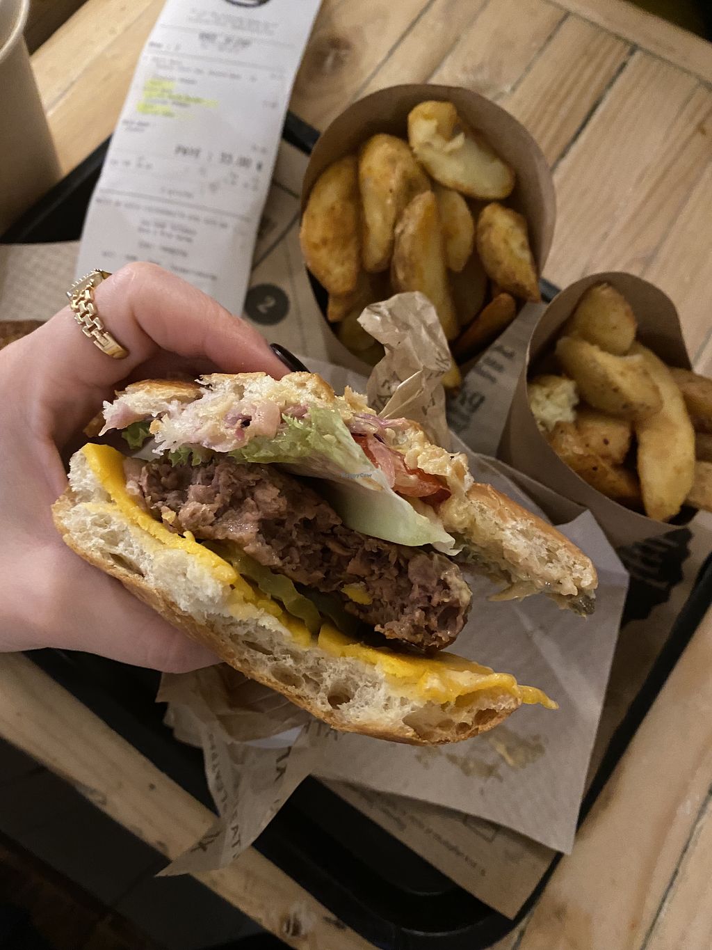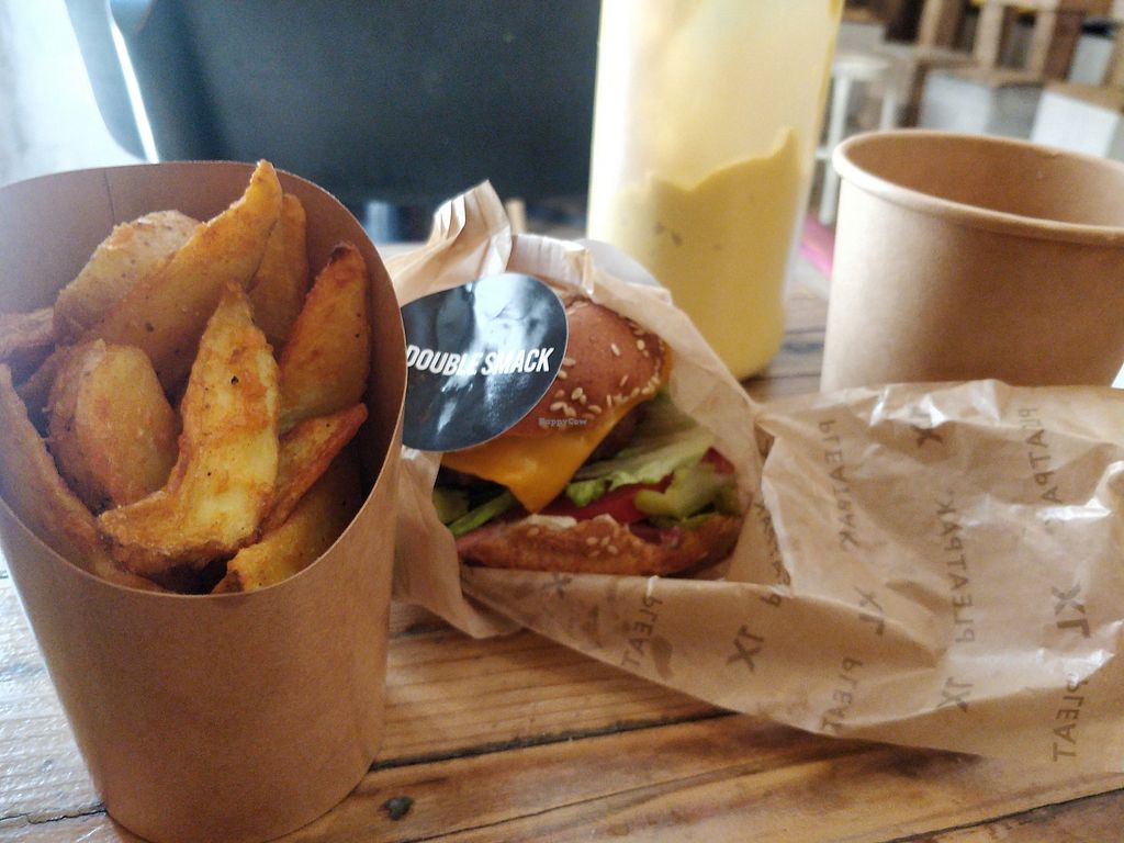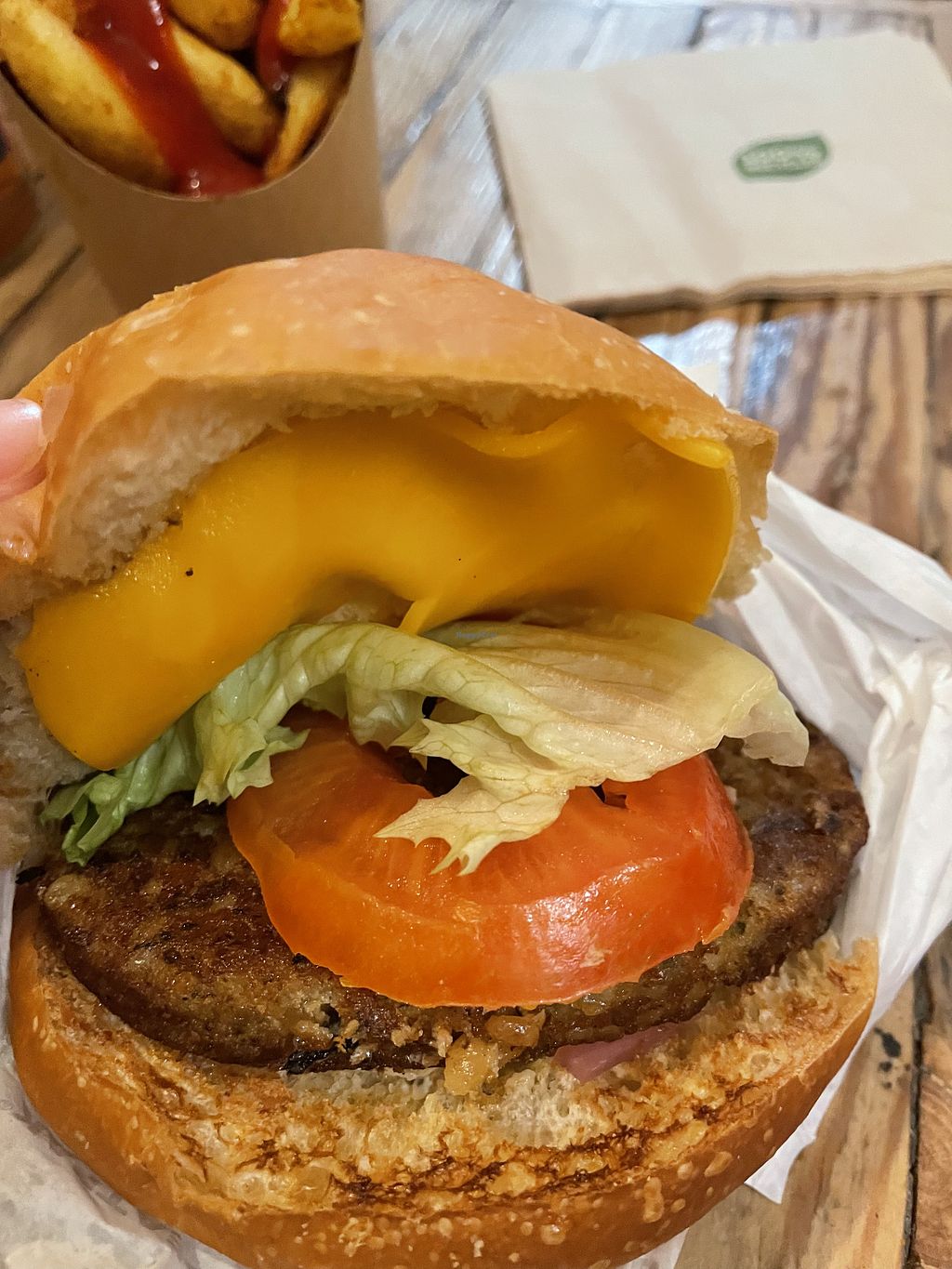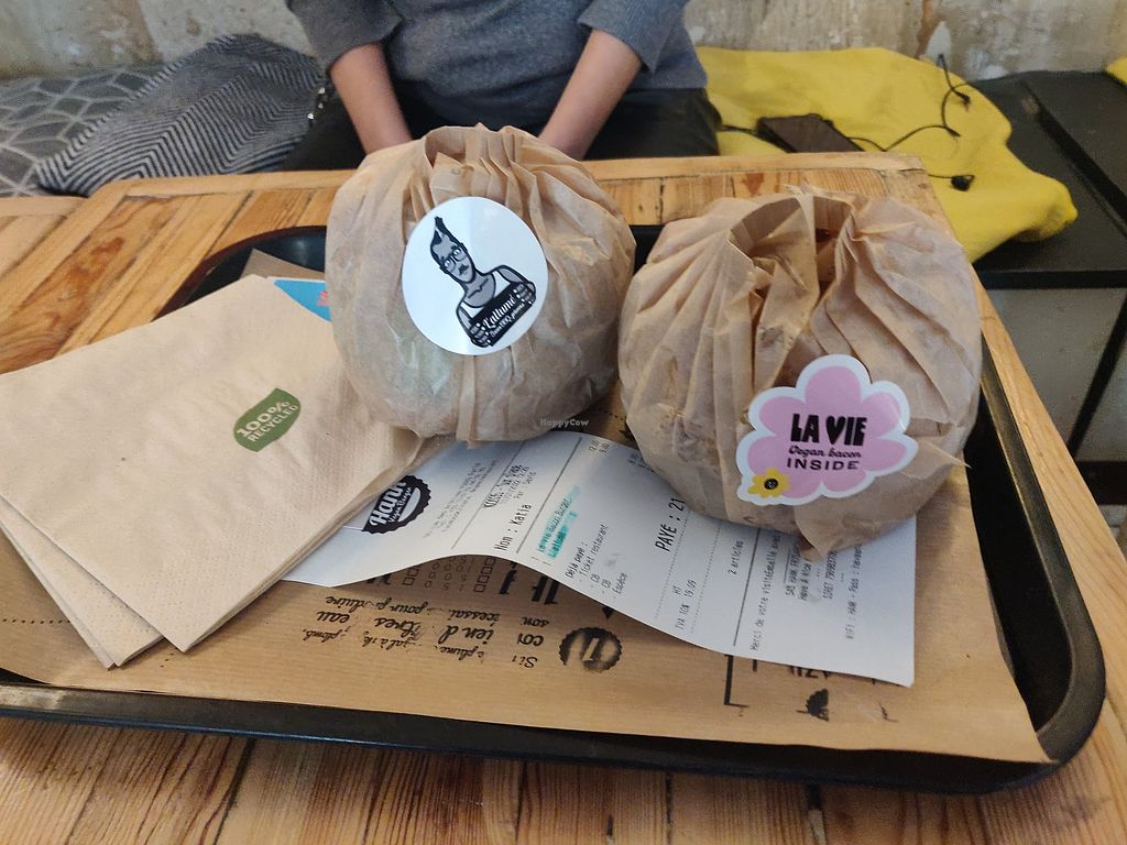 Burgers before unwrapping, with vegan facts on tray (Dec 2021)