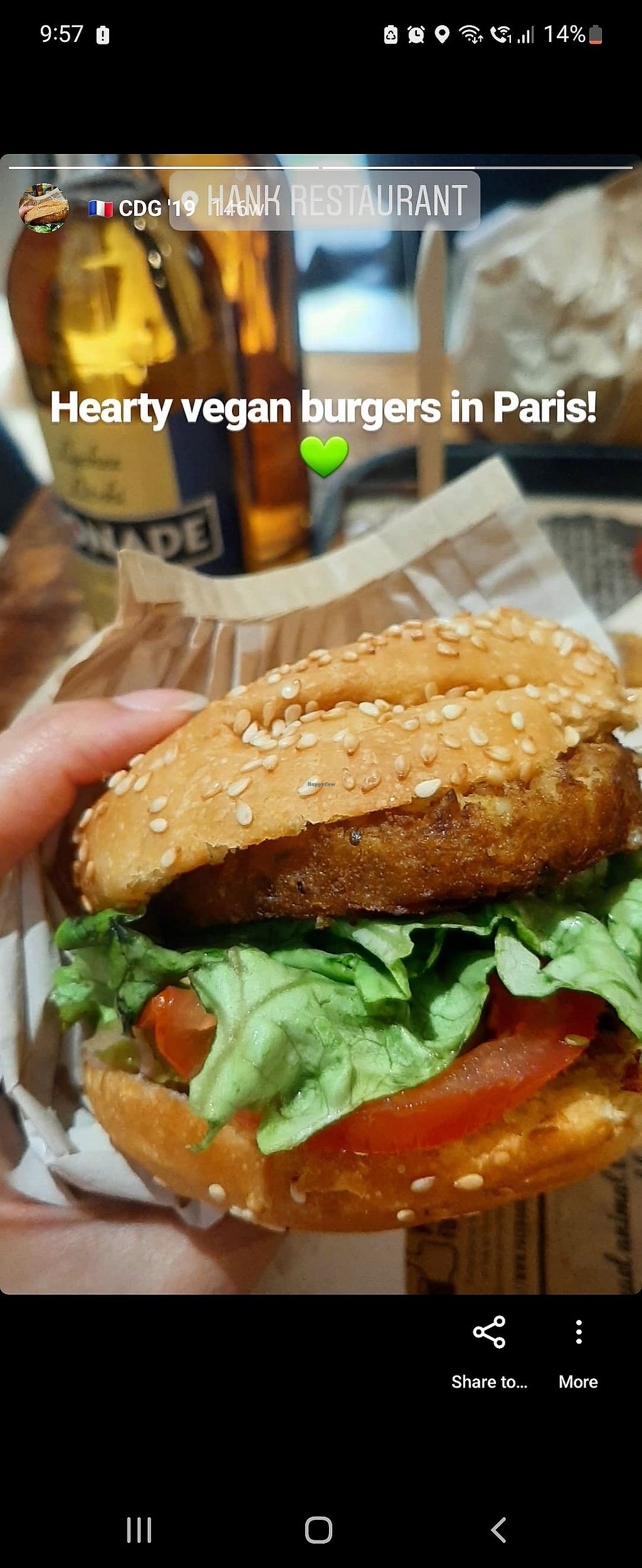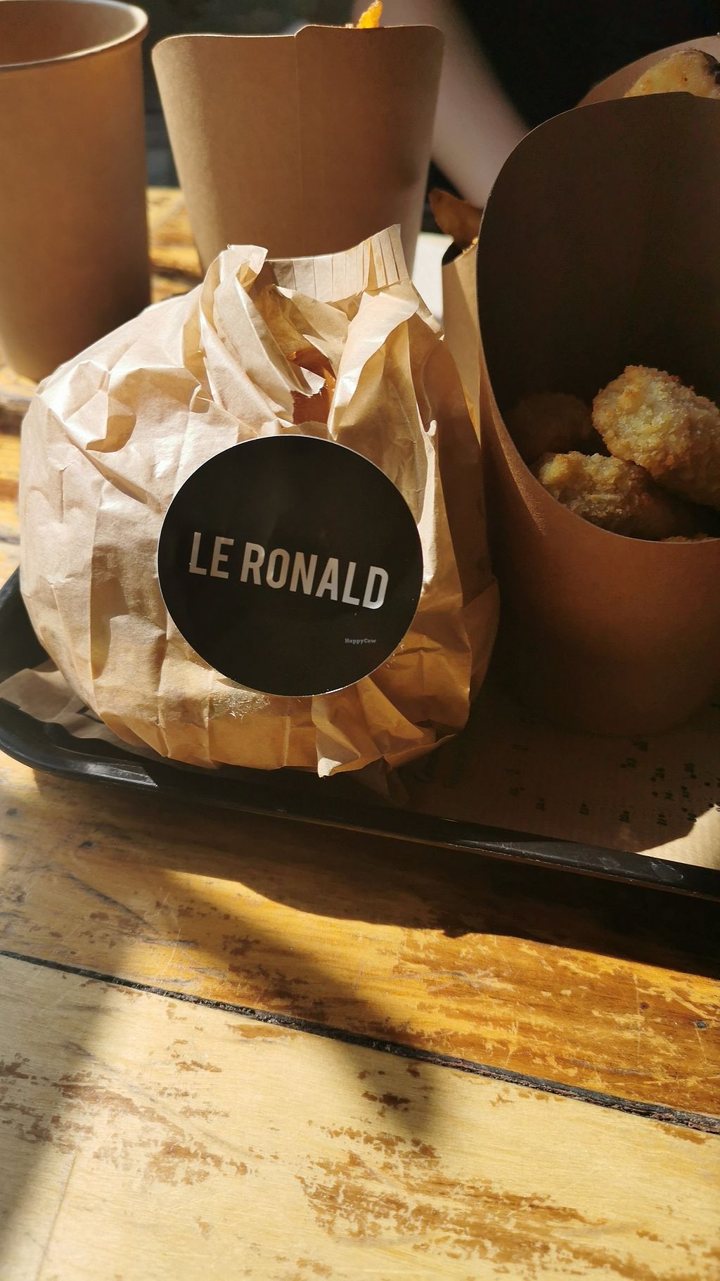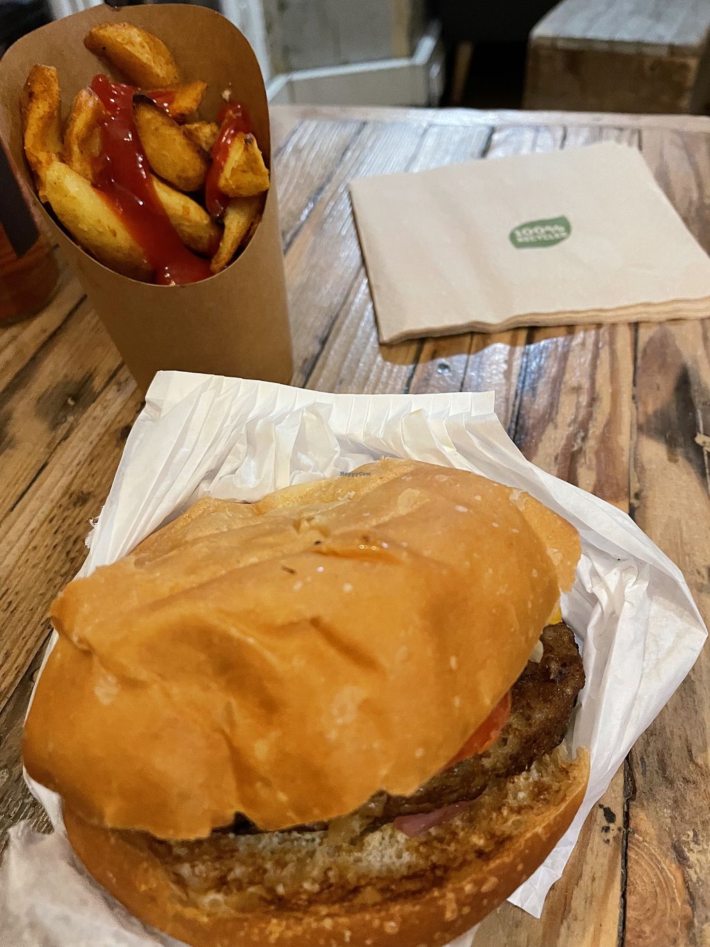 Burgers before unwrapping, with vegan facts on tray (Dec 2021)