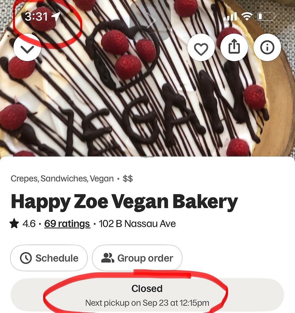 You should check business hours on google maps . We update our business hours every single week. Our bakery was opened at 3 pm on Saturday. We had customers in the bakery until 5 45 pm on Saturday 09/20/25. We don’t deliver through delivery app during weekends.