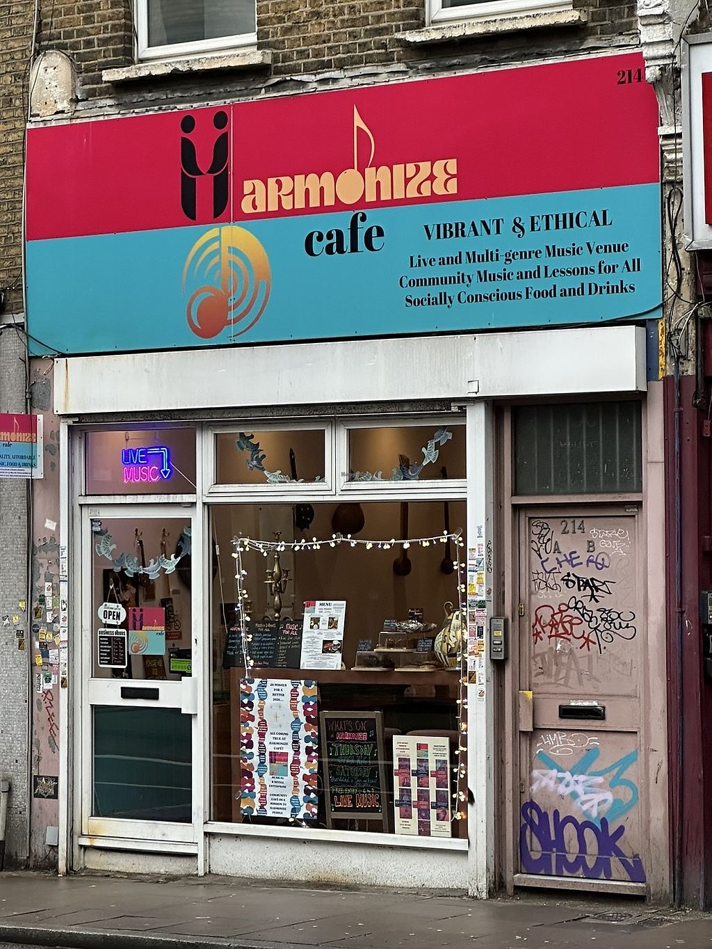 A musical and social enterprise operating a community cafe space with a completely plant-based menu. The establishment utilizes a fair "Colour Pricing" sliding scale based on a customer's individual economic and health situation, aiming to make food affordable to all and offering free meals for people in need. The menu highlights comforting house dishes such as the Incurrydible (curry) and the Indahlgent (dahl), alongside versatile Pancrepes that can be customized with various sweet and savory fillings. The beverage selection includes socially conscious beers, organic wines, and specialty coffees with complimentary plant milk. Open Tue-Sat 09:00-21:00. Closed Mon & Sun.
