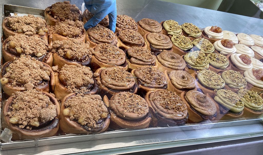 Everything is vegan! The cinnamon rolls are super rich and generously topped—every flavor looks amazing. Pistachio lovers, don’t miss the delicious pistachio cinnamon roll.
