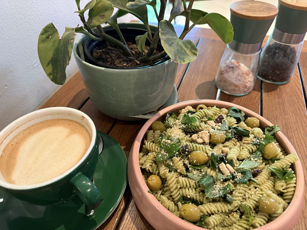 Had the green pasta with olives, basil, sundried tomatoes, cashew cheese. Delicious. Located next to Trademark hotel.