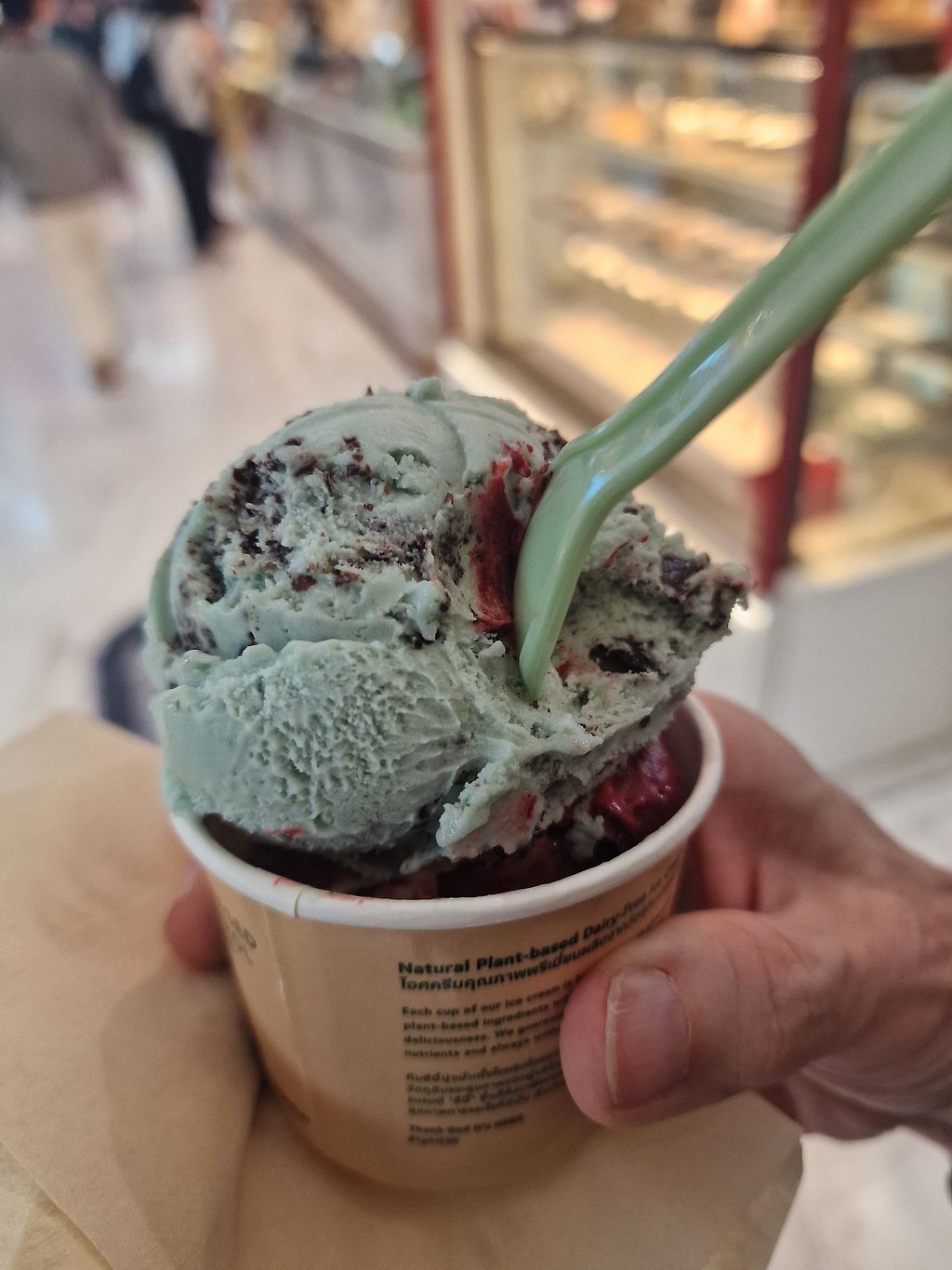 Ze hebben verschillende ongewone smaken, zoals munt/chocolate (eindelijk vind ik hier een vegan variant 👏🏼), Thai en nog een paar andere (ben ik even vergeten 🫣). Ze hadden lekkere hoorntjes, zelfs met chocolade smaak! (Naast deze staat een andere ijsboer, die ook vegan heeft!) #Veganuary