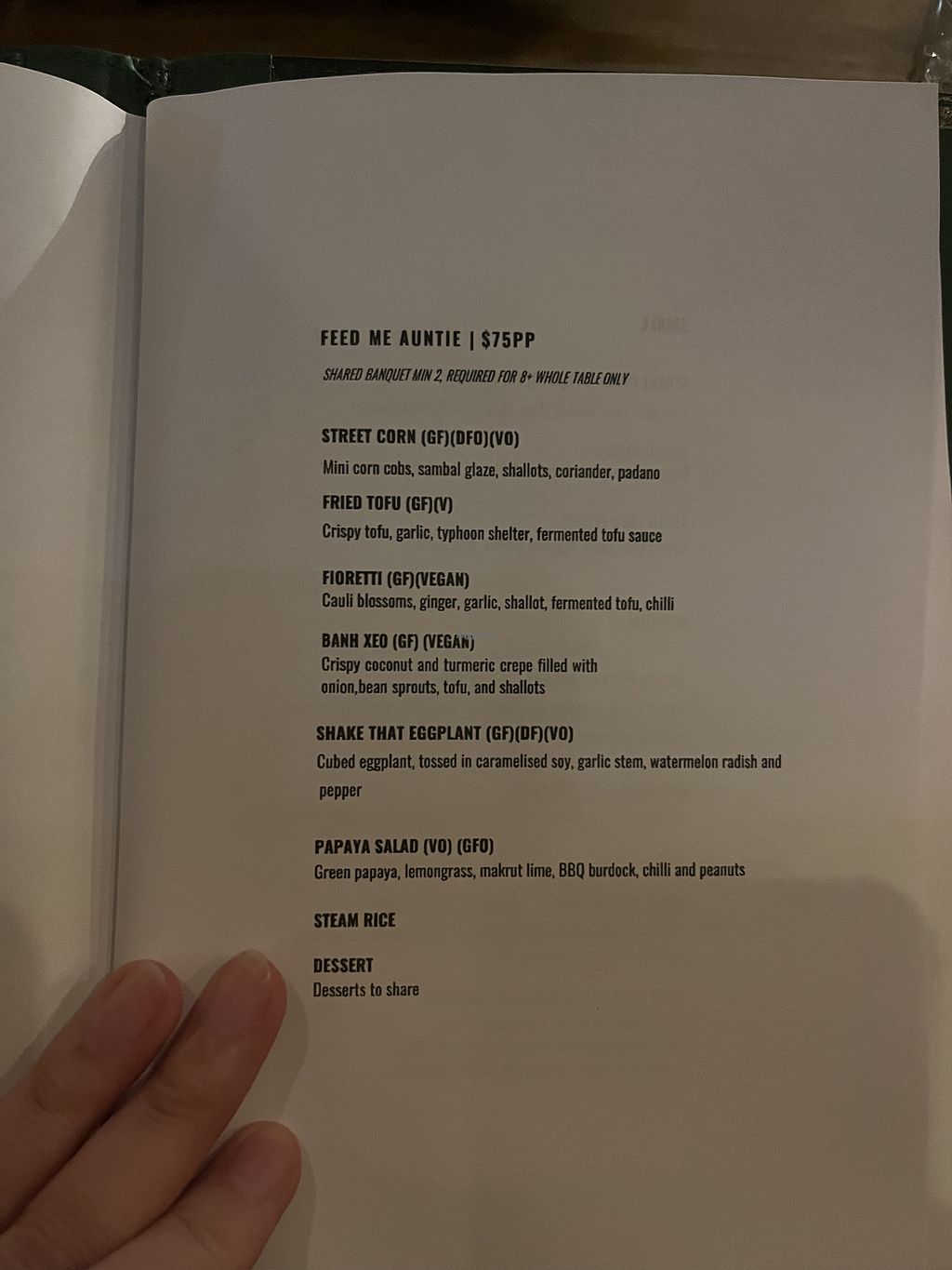 We shared the filled coconut and turmeric crepes and BBQ eggplant from the vegan menu and they were both sensational! There was a lot of food too, enough to fill us both plus a takeaway container. Lovely atmosphere, nice staff. Thank you for having a vegan menu!