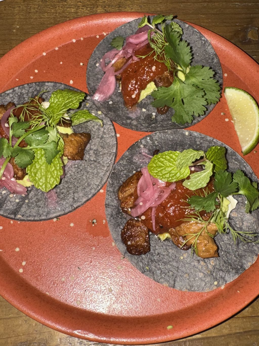We got a complementary amuse-bouche which was a nacho with cream cheese and mushroom. It was delicious, that’s all I remember. Then we shared tacos, a taco salad, and kimbap. I especially liked the tacos and kimbap, the salad was good but not out of this world. Overall a great place for dinner!