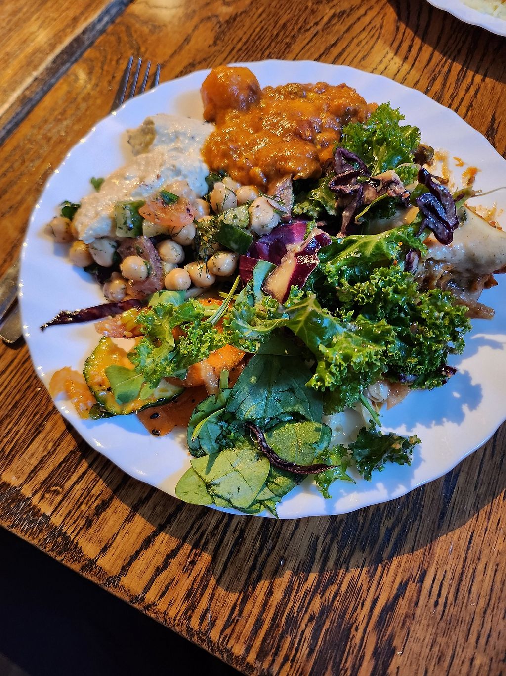 Went there with no expectations, paid the pricey fixed price of 310sek to get access to the buffet, there were a few options for hot meals (miso, wraps, lasagna, curry, something else) and a lot of salad choices. Everything I tried was super tasty. There were many interesting sauces and dips to try out. The place was cozy and is on a cliff with a gorgeous view of the water. Best to go here when you plan to chill for the whole evening, because for one plate meal it's a bit expensive.
