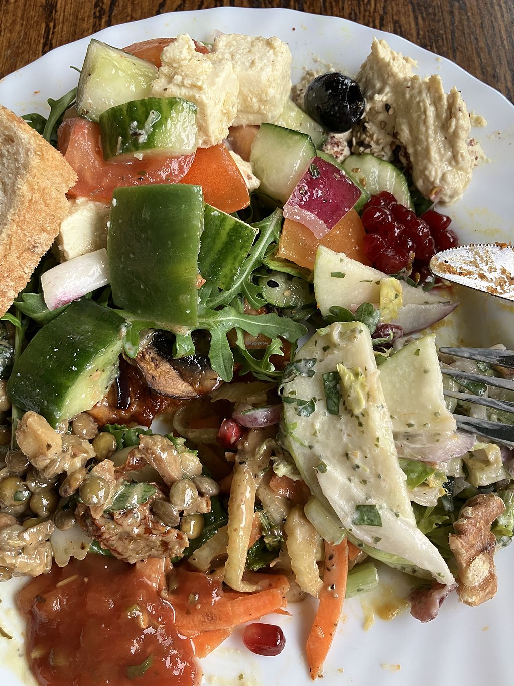 First of all - such an amazing view and we were also very lucky with the weather. I love that a vegan place is situated at this very spot and features this big terrace overlooking the city. Then of course - the all you can eat buffet! We came hungry, so we were able to enjoy numerous dishes, salads and dips. I had a delicious lemonade too. We were among the first for the day, so the buffet was also still untouched, adding even more glam to the whole experience. The staff were very friendly and I just simply didn‘t want to leave. Definitely going back…tomorrow! 😁