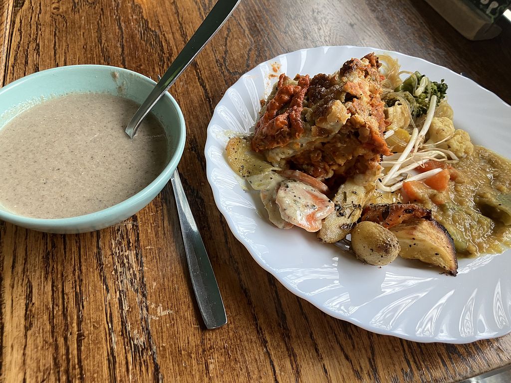 The food was really good, the buffet looked great. So many options to chose from, soup, salads, bread, pasta, potatoes. Tee, coffee and water for free. They also offer student discounts. Nice garden with different levels and a view over the harbour.