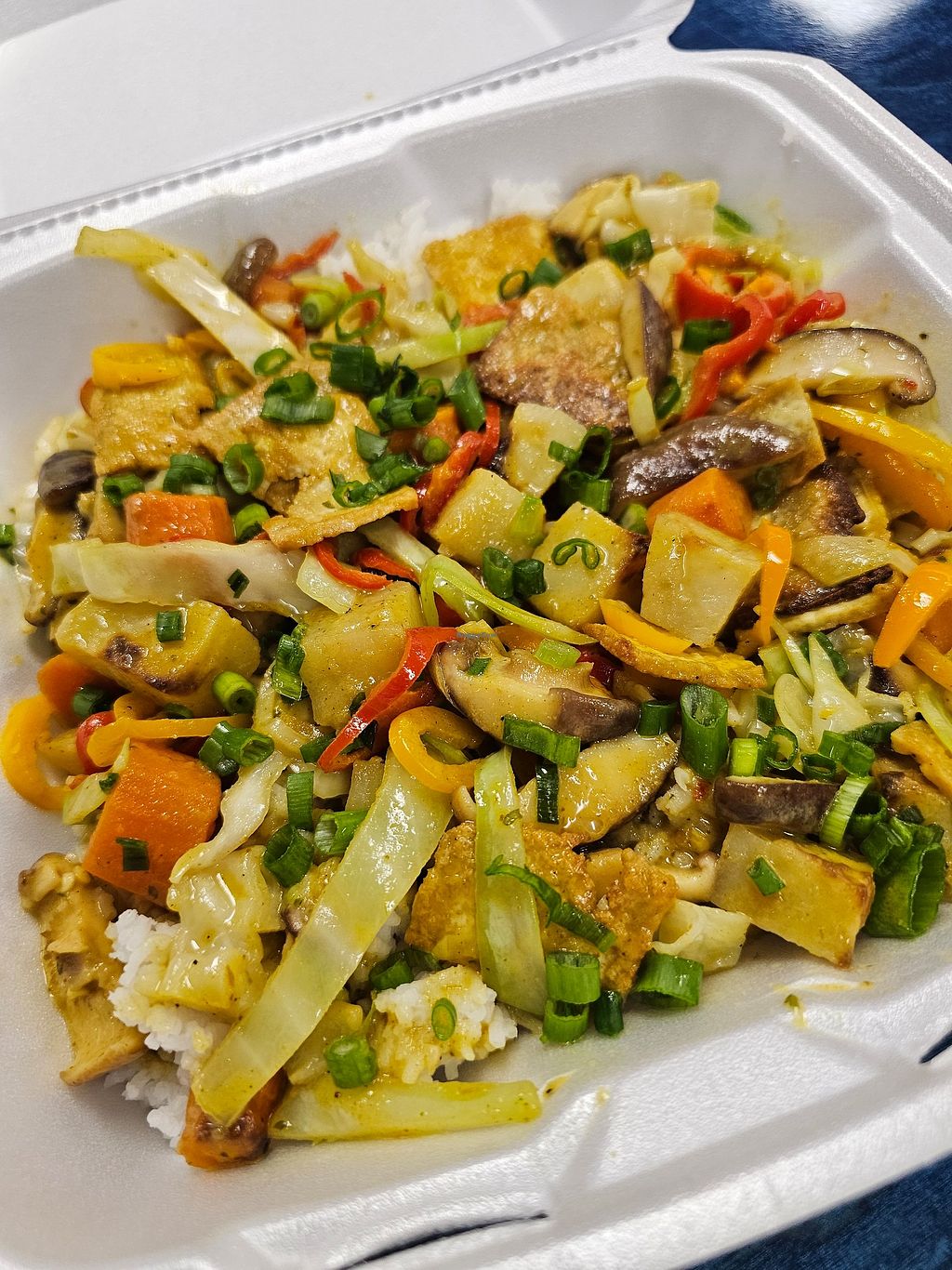 I agree with the post that says don't mind the fact that it's in a game card shop. I found this place to be a very unique and neat little spot. I absolutely love the yellow curry, it's one of the best that I've had in South Carolina. Also had the sweet chili with tofu but I wasn't that much of a fan. I feel that the sauce needs to be thicker. The vegan buns were also pretty good. The server was very knowledgeable about what was vegan and what was not.