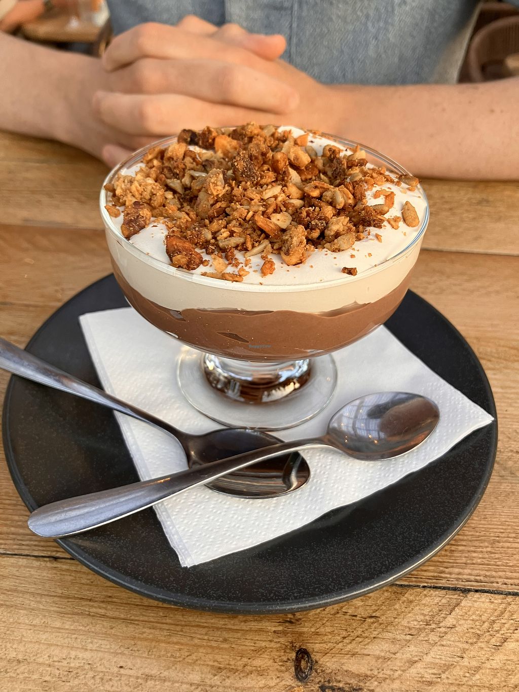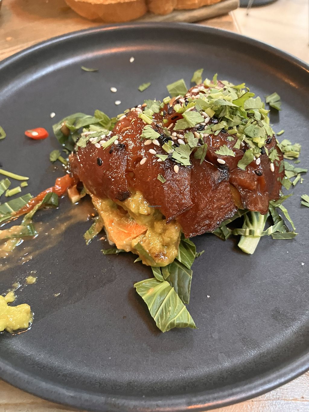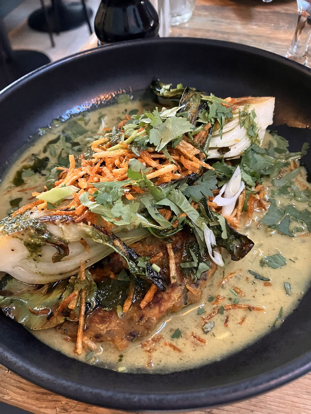 A good place to go with omnis. Impressive wine list. Two vegan starters, 3 vegan mains, 1 vegan dessert. Saw the Festive menu which had more options. The sweet potato fritter "burger" wrap was odd as the fillings weren't in the wrap, but was tasty- had a great flavour of ginger. Delicious oat latte, and pleasant and helpful staff.