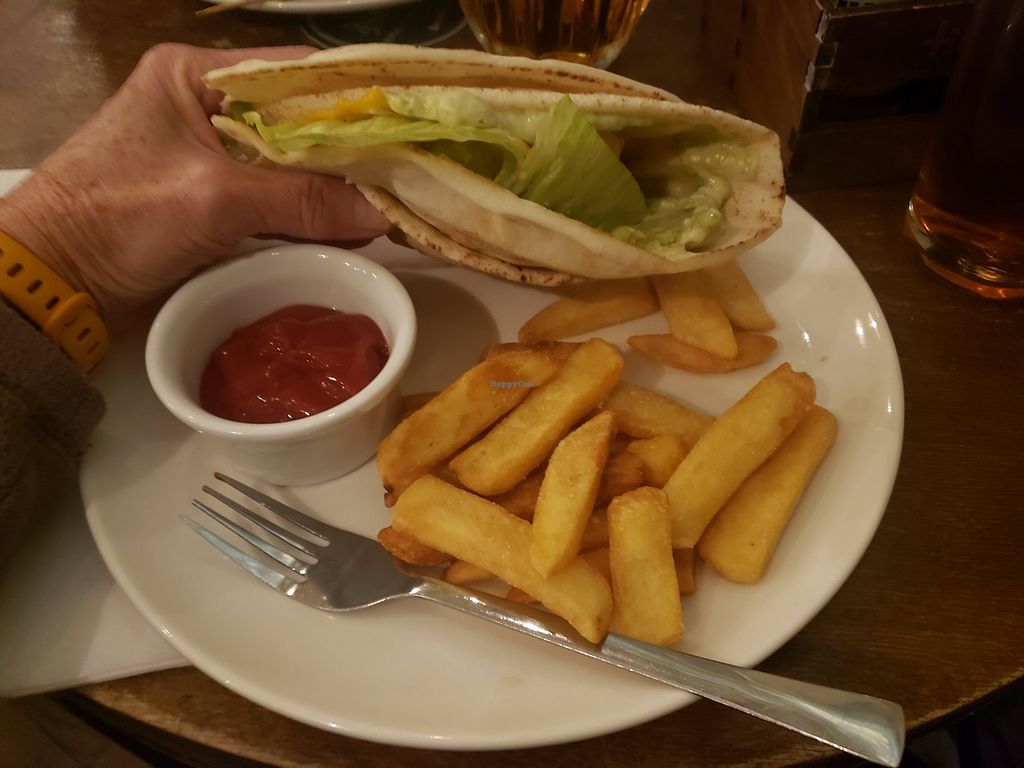 The former synagogue has been transformed into a very cool bar and eatery that appeals to many locals. They offered two vegan options: a Beyond Burger and a veggie risotto. The Beyond Burger came in a folded large tortilla with a generous amount of mayo and lettuce toppings. Thick fries and ketchup came as sides.