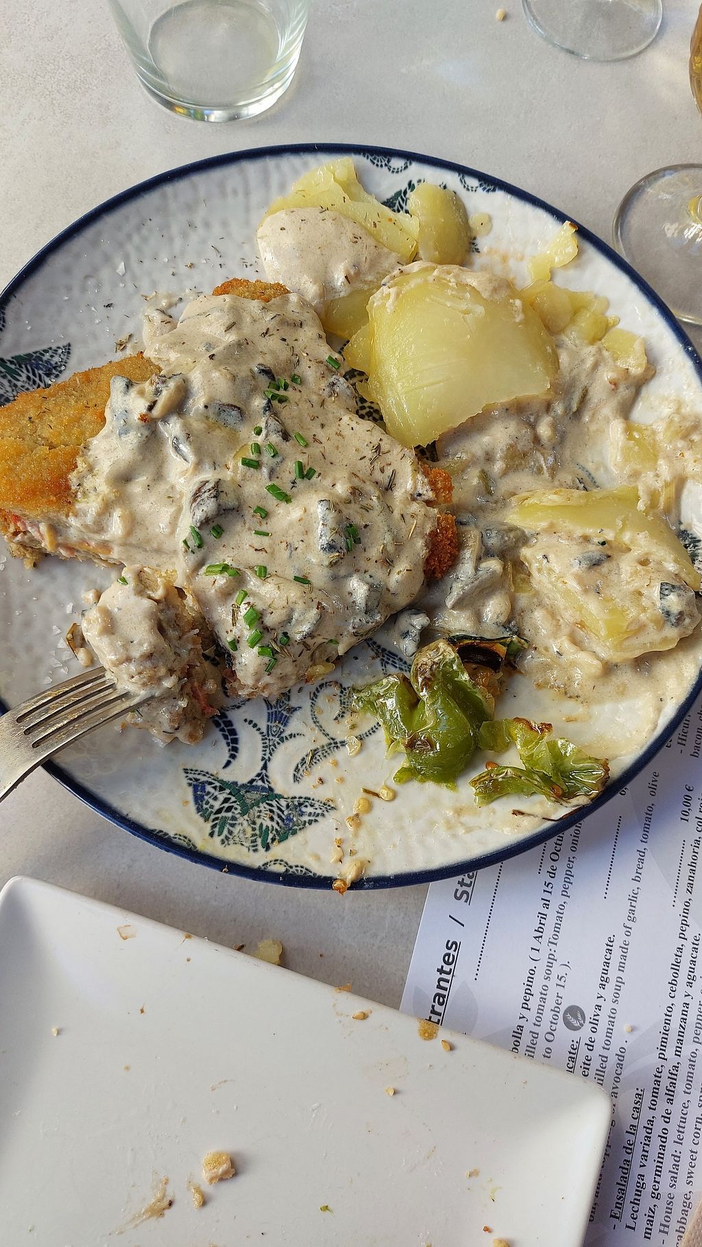 Beautiful art on the walls, friendly waitstaff, delicious croquetas, salmorejo, Cordon blue, and vegan paella. Our favorites were the spinach croquetas, and the Cordon Blue (we bought extra to eat for dinner at our hotel😋)