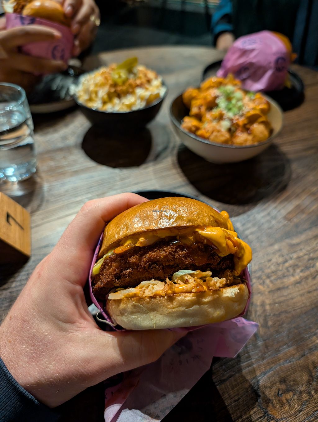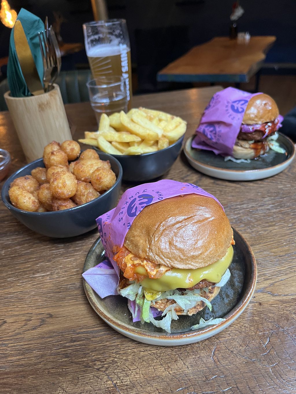 We started with the mushroom wings and they were excellent! The batter was super crispy and flavoursome, and they went really nicely with the truffle mayo which had a strong truffle flavour. The classic Mac 'n' cheese was also very tasty with lots of sauce and a nice big portion size. The kimchi cheese tots were also so good with lots of sauce, delicious kimchi, and nice crispy, crunchy tots. Lastly the burger was also very tasty with a delicious, soft brioche bun and tasty fillings, really good!