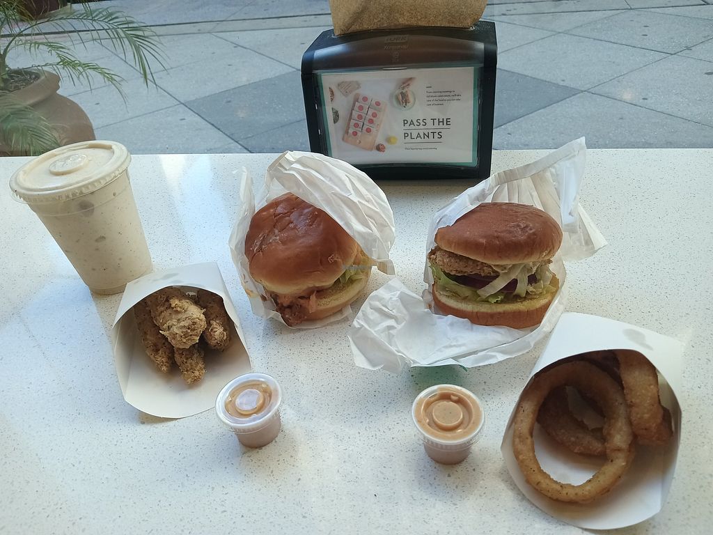 Pass the plants! A vegan feast! Left to right: caramel apple shake, ch…
