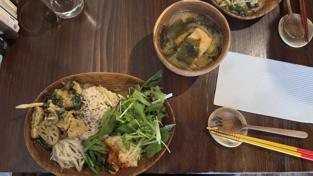 Nestled in the alleyways is this vegan, organic establishment. The owner is very personable and friendly! Food was fresh, delicious and just what we wanted after arriving in Osaka. Limited seating, it’s a small restaurant in an older building. They have 1 set meal that rotates daily as well as seasonal dessert offerings, chai, coffee, and other beverages. On the day we came, set meal included avocado, mixed greens salad with dressing, coconut curry stir fry with eggplant and shimeji mushroom, tofu, and a delicious miso soup loaded with mushroom and sweet potato which cost 1500 yen. Also a perk is this is a gay friendly restaurant!!
