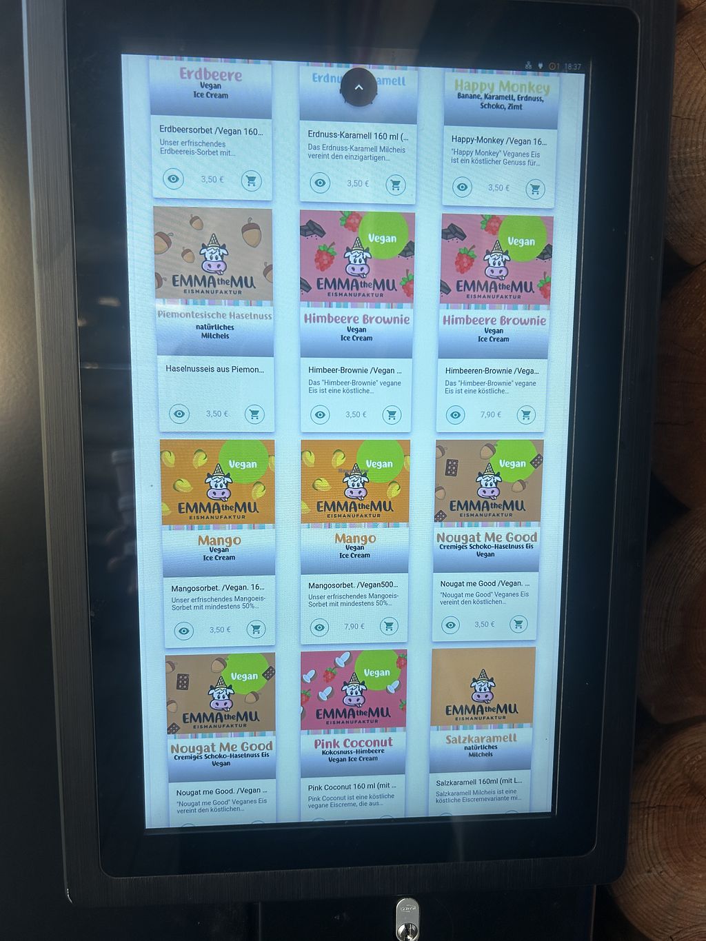 Read moreDirekt neben dem Eisautomaten stehen noch verschiedene andere Automaten, unter anderem ein Kaffeeautomat sowie mehrere mit Lebensmitteln, die je nach Saison wechseln, zum Beispiel auch Spargel.