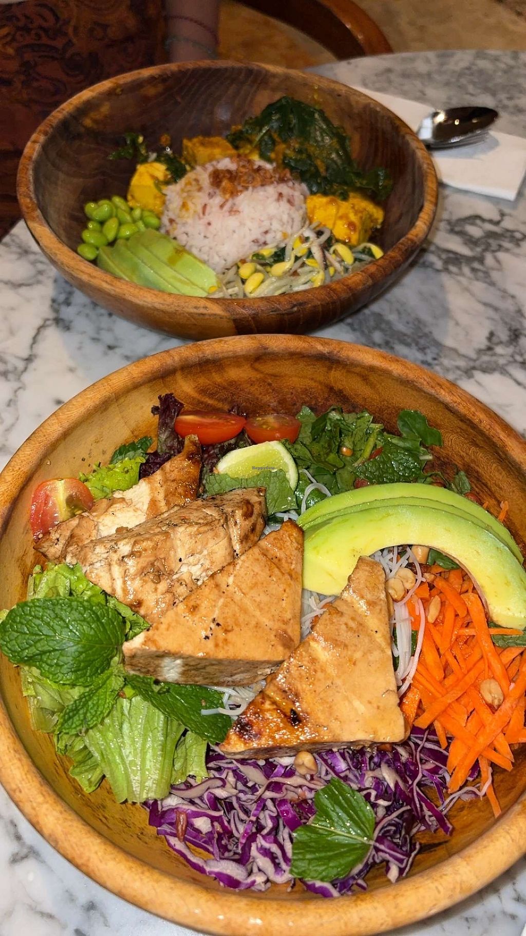 Serves meat, vegan options available. Indonesian inspired restaurant with a variety of hot and cold dishes, as well as snacks and beverages. Has juices, smoothies, smoothie bowls, savory bowls and more. Vegan items marked with V. Open Mon-Sun 8:00am-11:00pm.