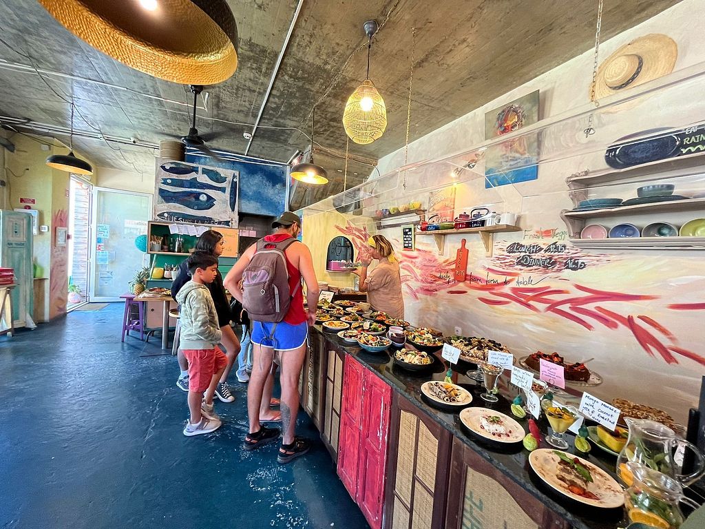 A great spot to stop for lunch near the beach, delicious and filling salads, wraps, shakshuka, dips…. Everything we tried was excellent! Some tasty vegan desserts too. Outdoor seating on a rooftop or deck.