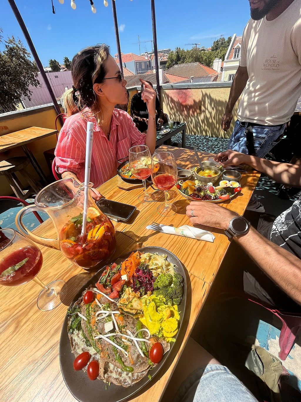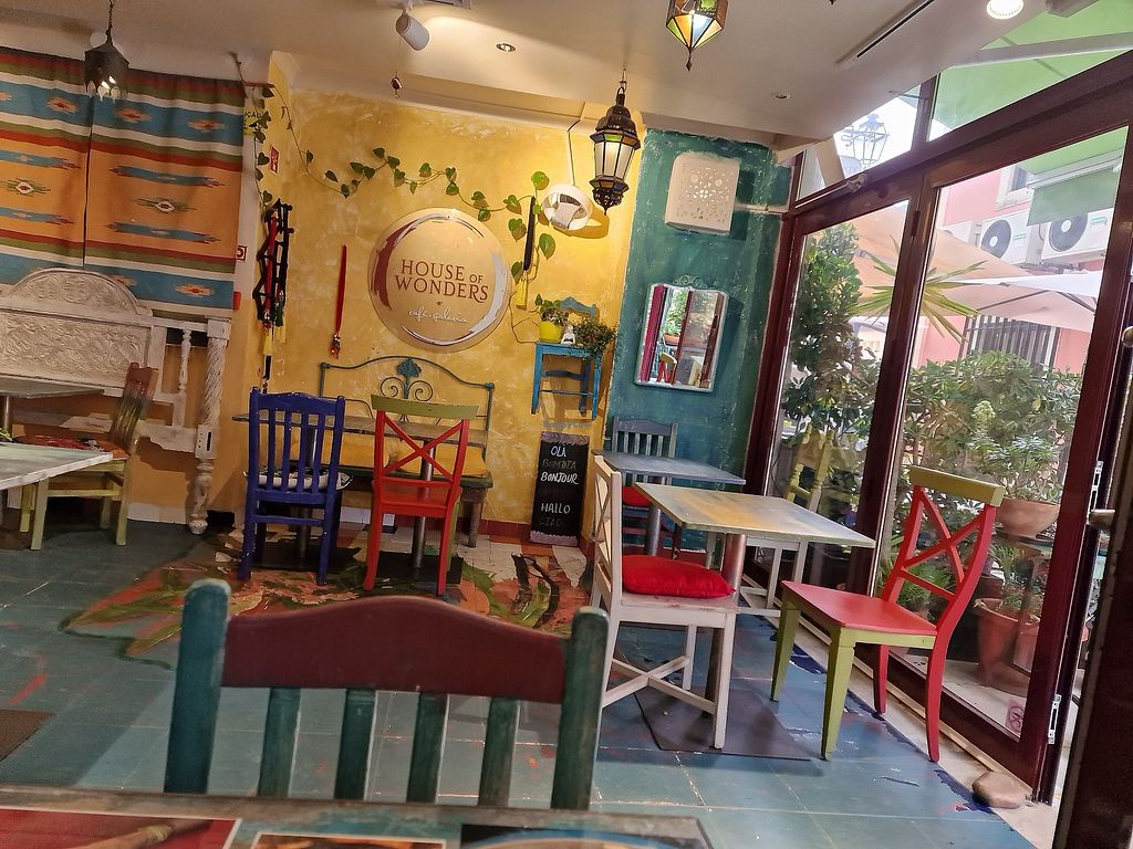 This is a full vegeterian restaurant with many vegan options ( also possible to make some dishes vegan). The staff is friendly, the location is good. They have a visual menu where they show all the food in front of you, so you can choose what you like. Even you can get an explanation what are the ingredients etc. I understand that concept might come across as a waste of food as they have to cook all the dishes everyday (and throw away possibly at the end of the day). The menu has a fixed price of 14,75 euros per plate. In addition, there you can find refreshments as homemade lemonade, orange juice etc. The food is quite tasty ( although I found some of the options a bit simple). The atmosphere is really perfect. Loved the decoration, the patio is amazing, also the rooftop is really cool.