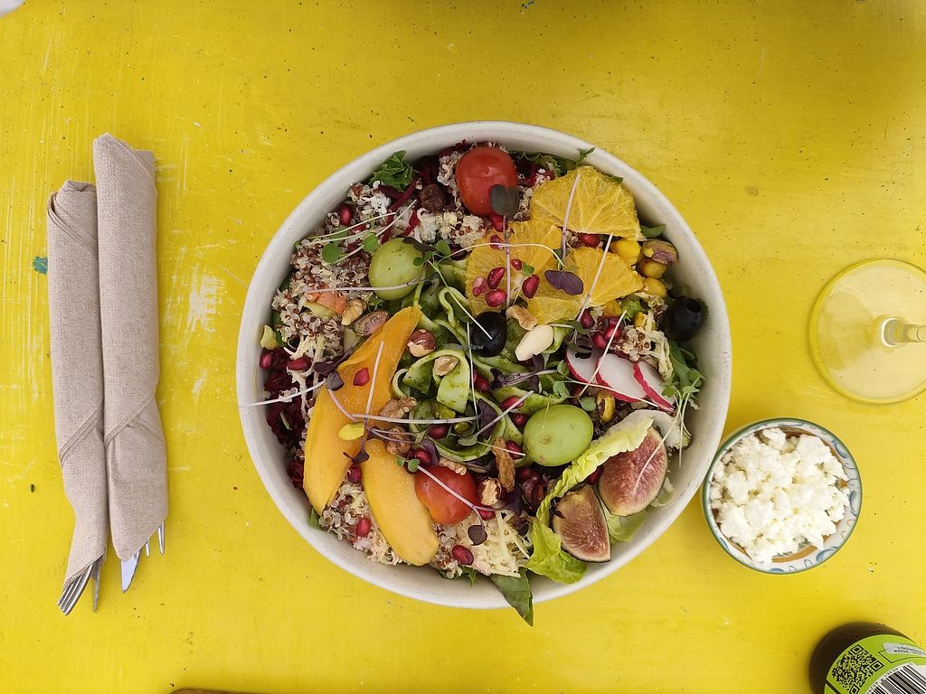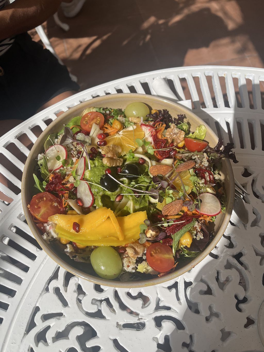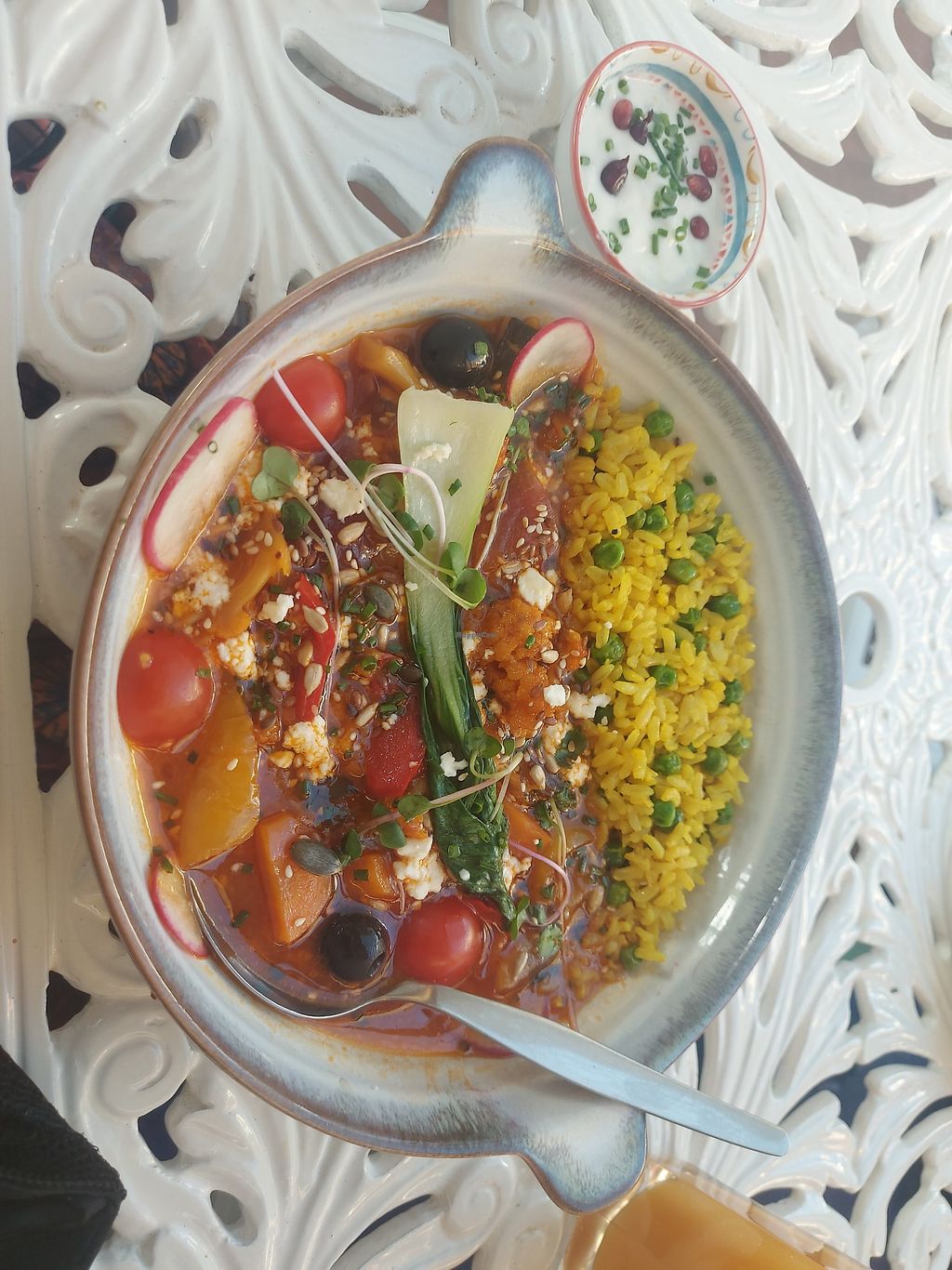 Fresh, colourful organic food. They have all the dishes on display so you can see how it’ll be once it’s cooked. Many of them can be made vegan. There’s a fixed price by person rather than by dish. The atmosphere is quite eclectic and relaxed. I recommend the rooftop terrace at sunset!