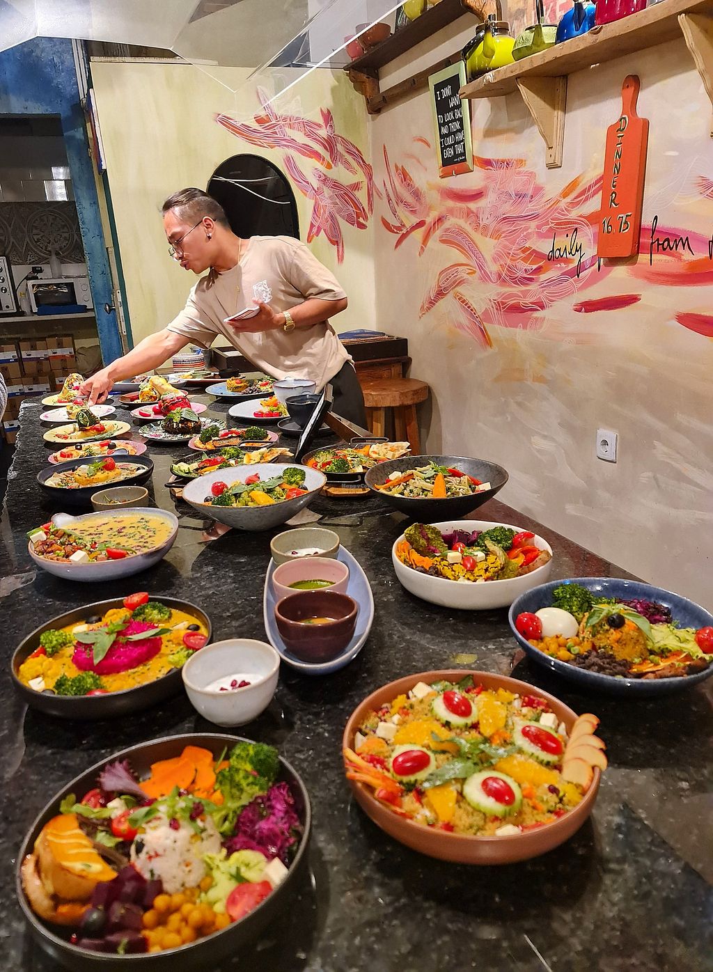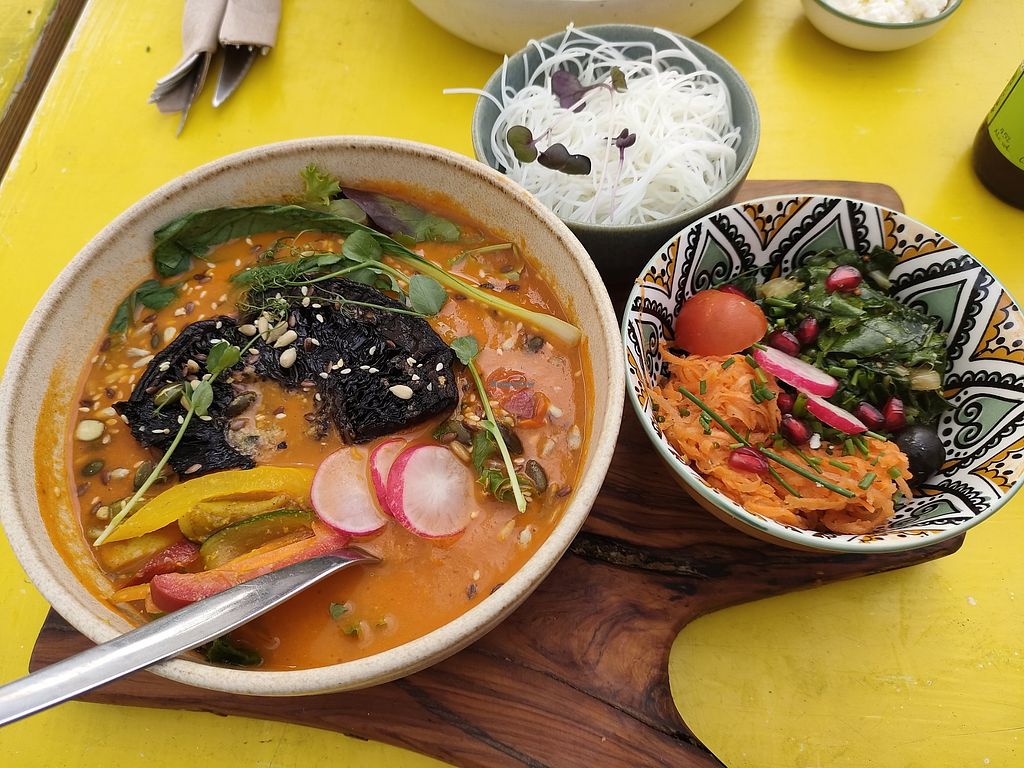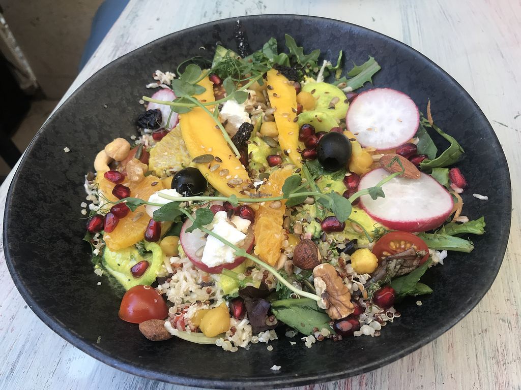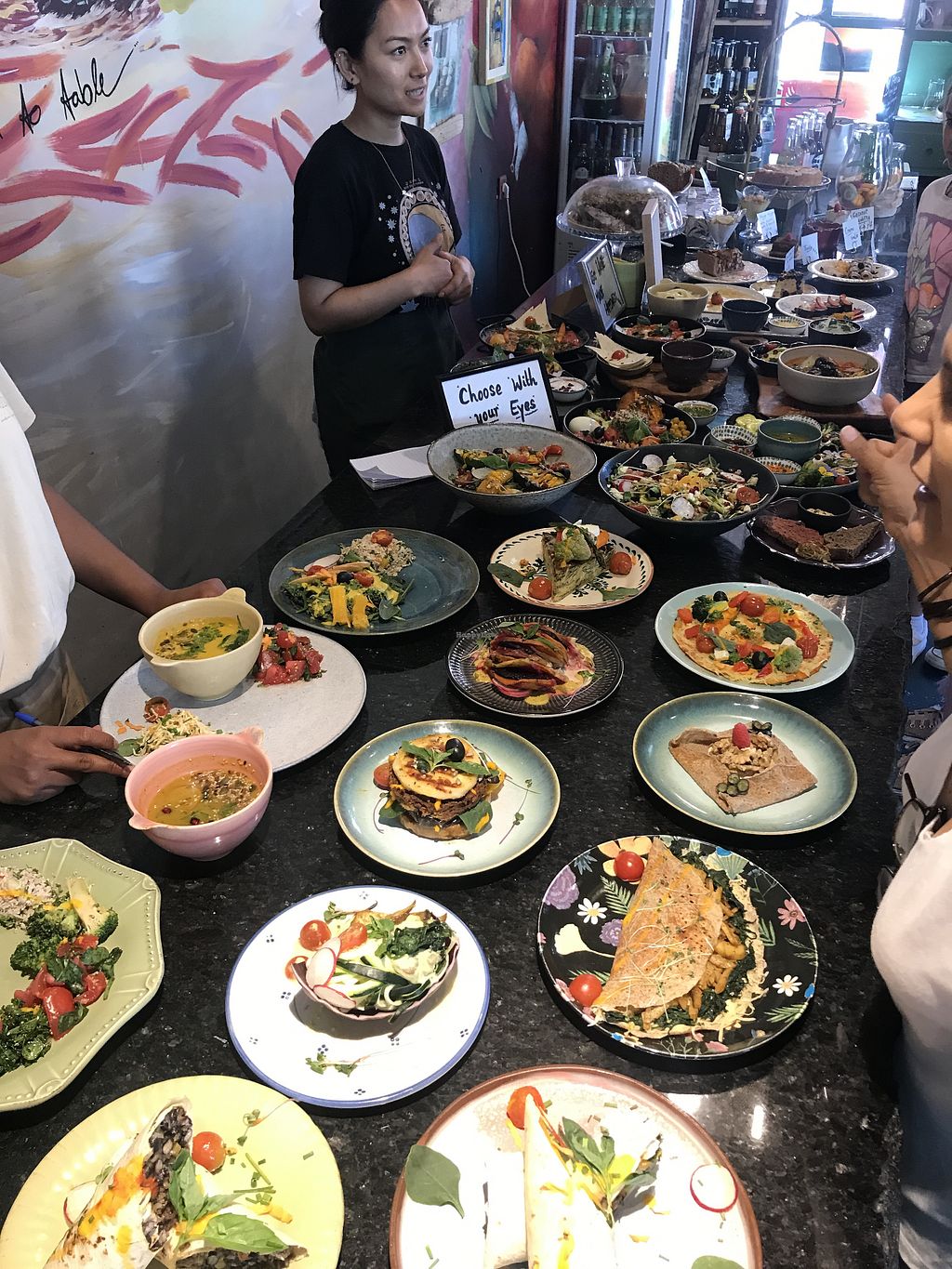 Fresh, colourful organic food. They have all the dishes on display so you can see how it’ll be once it’s cooked. Many of them can be made vegan. There’s a fixed price by person rather than by dish. The atmosphere is quite eclectic and relaxed. I recommend the rooftop terrace at sunset!