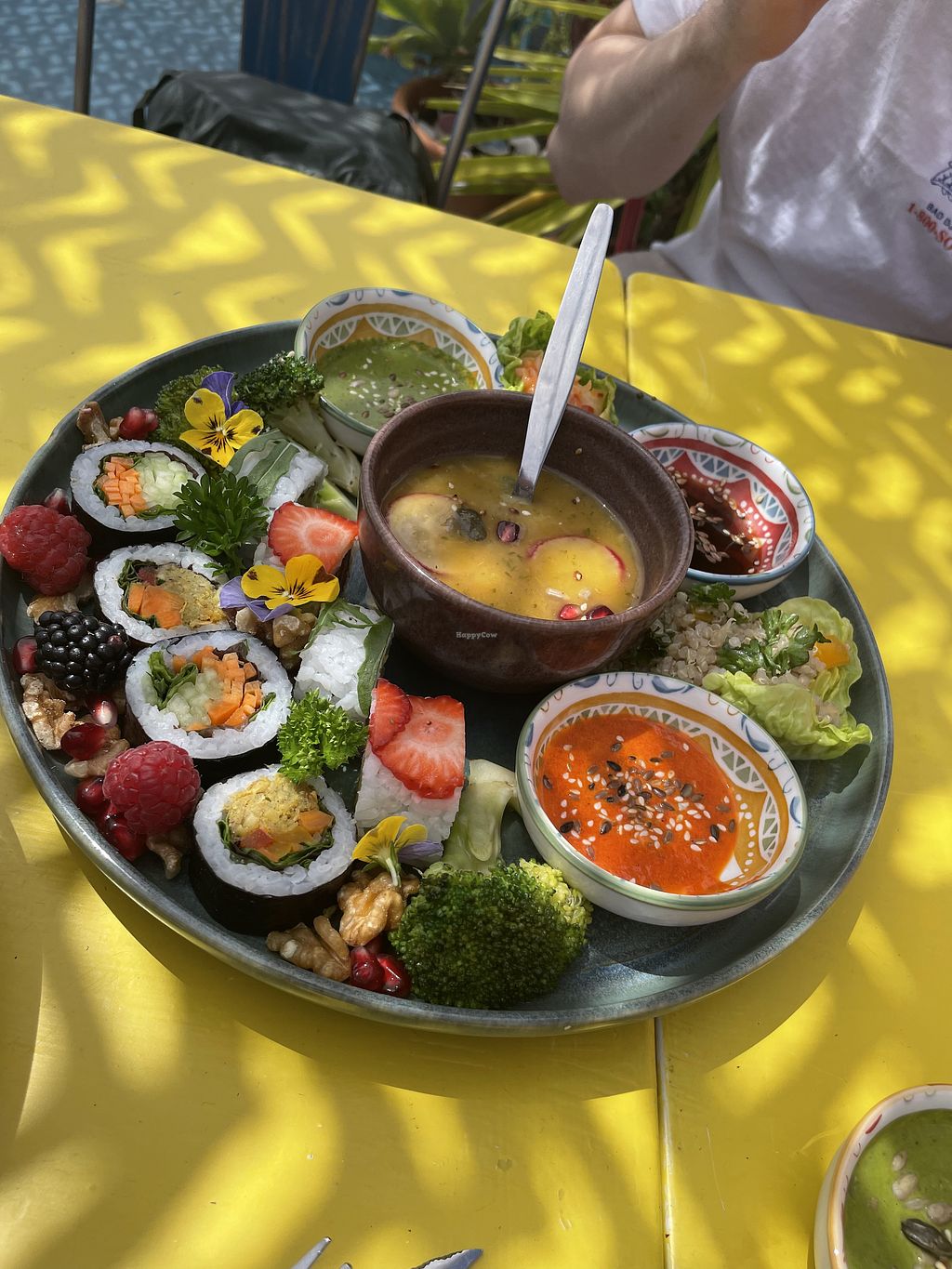 What a funky place with seating upstairs on the roof and outside. Recommend the roof. When you enter you see all the options available set out in front of you and you pick the plate you want. Was 12.75 euros for a plate. Lots of great options and all vegetarian or vegan as well. Nice variety of options and good taste. Excellent service as well being polite and fast.