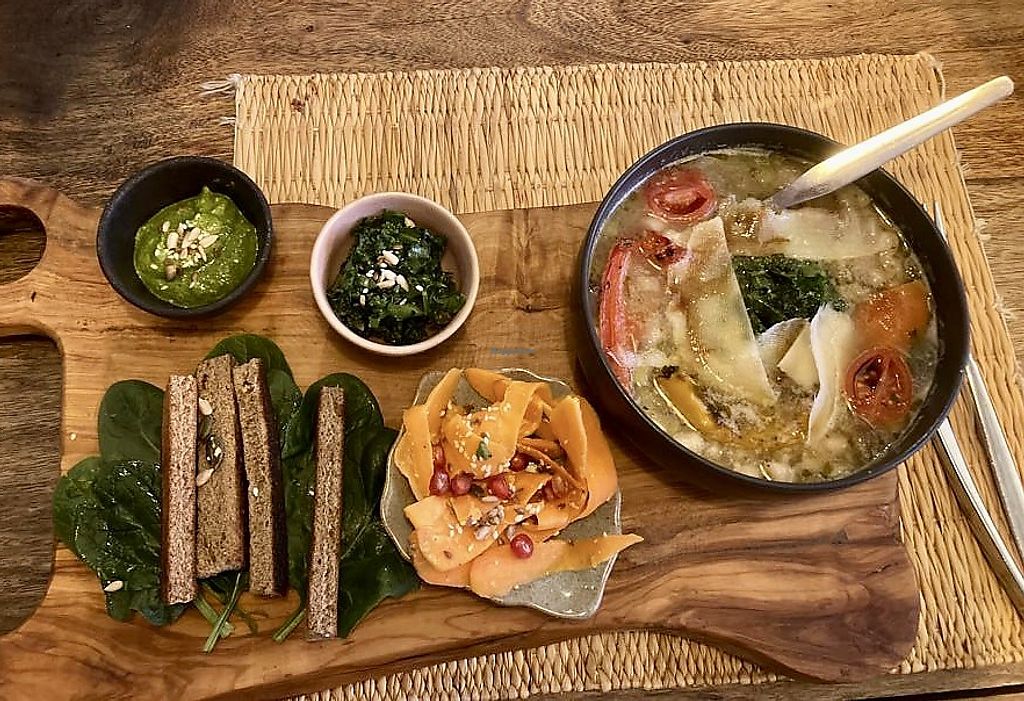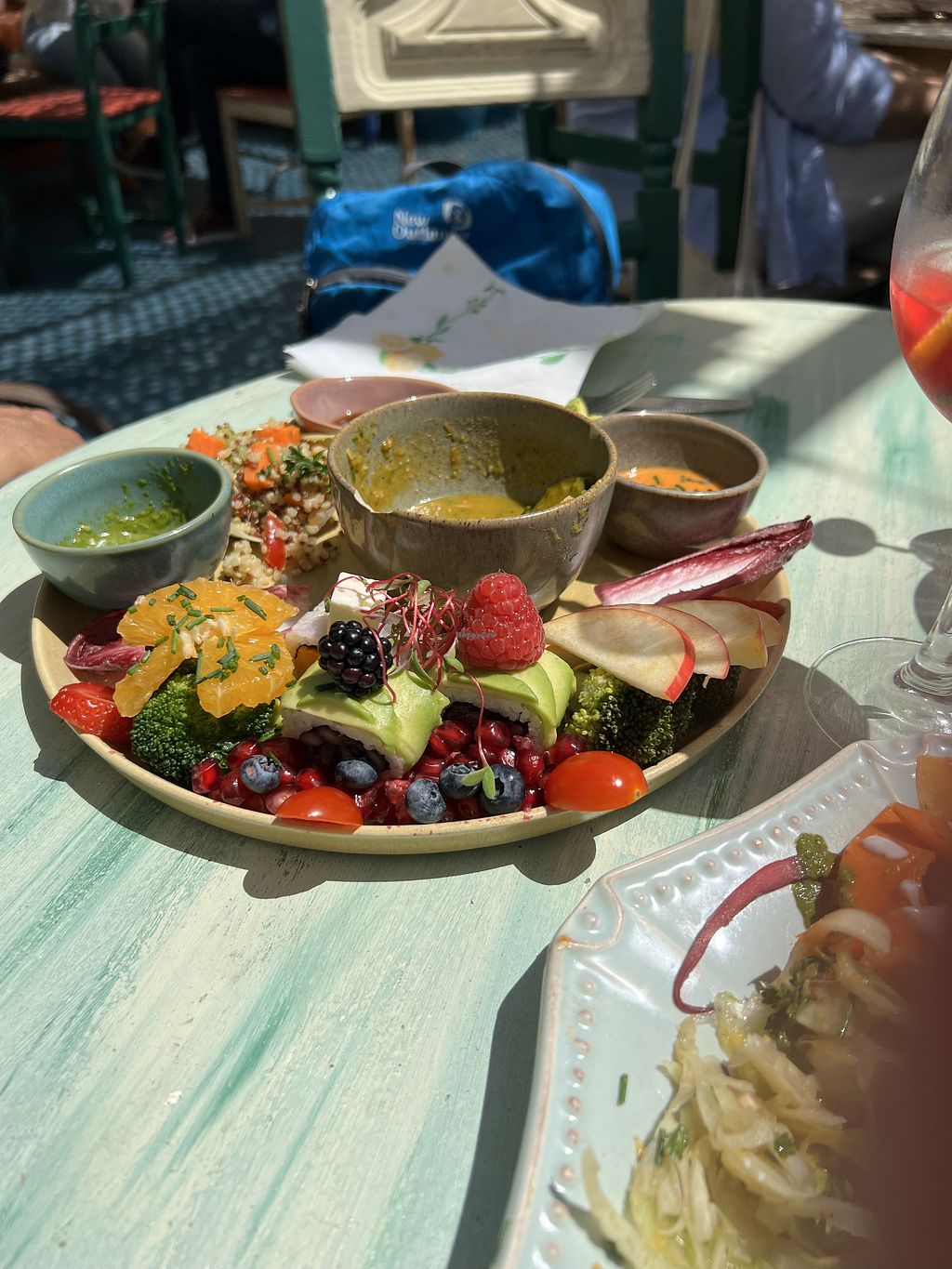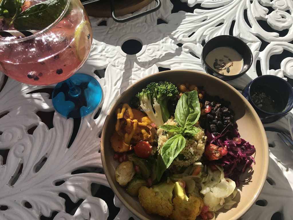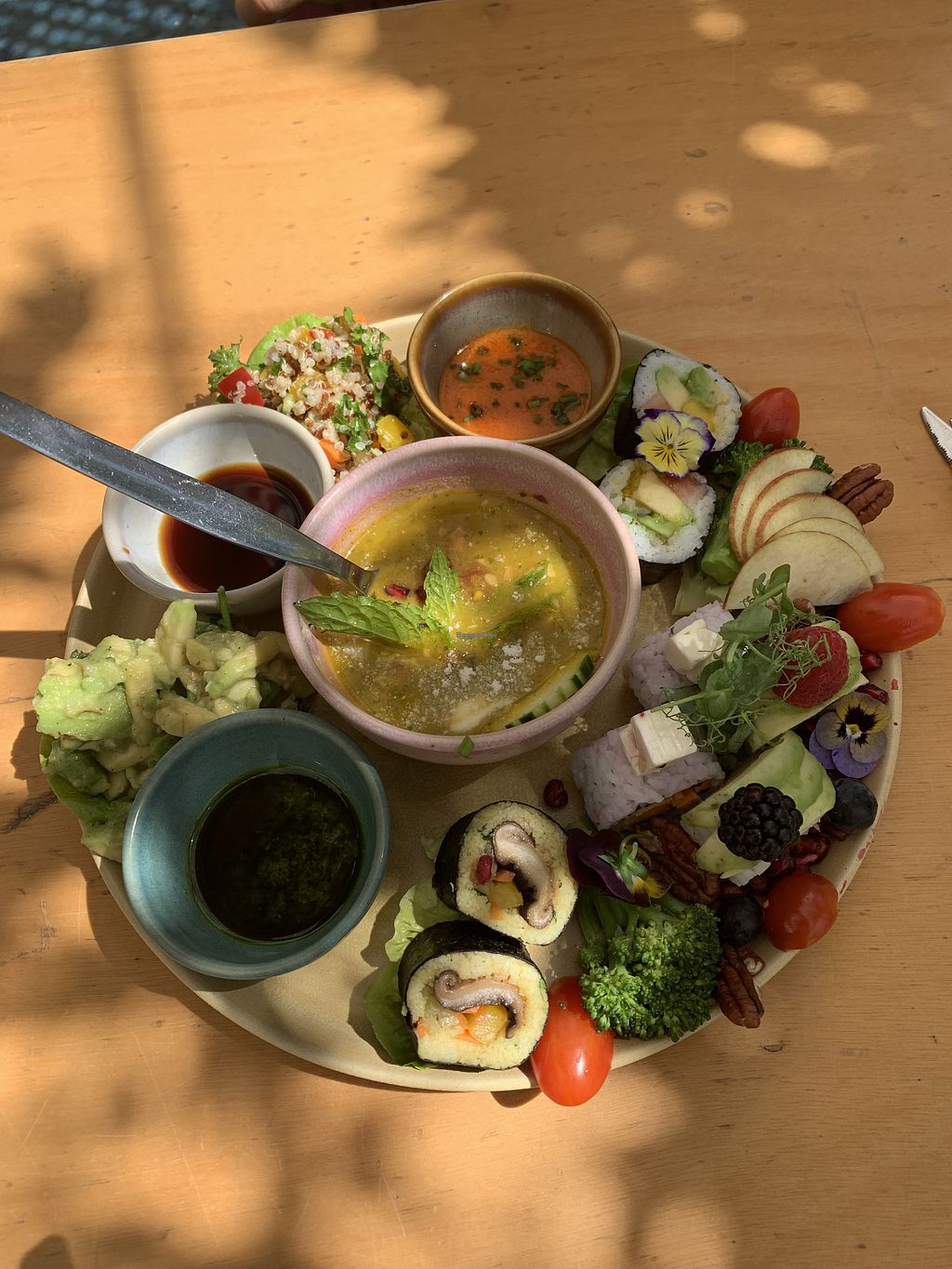 Best tasting and filling vegan cuisine I’ve had outside my own kitchen by far. Plus they had delicious juices and desserts. All served on a rooftop garden bar. So many gluten free options!!!!