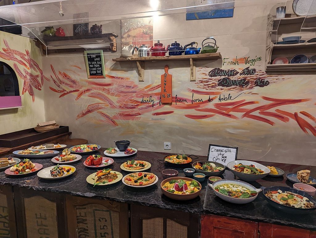 The restaurant at the alley level was empty, but we followed signs to climb the staircase between the two storefronts and found a lively garden patio on the roof, adjacent to the restaurant. A very happy server who loves his job and loves life ushered us into the second story restaurant, where we were greeted with a long table of that evening's menu items prepared as a visual menu. He explained to us (in English) what each dish was. The restaurant is fully vegetarian but most of the dishes had egg and/or cheese that appeared to be like paneer. All but three of the dishes (two of which were pizzas) could easily be made vegan, however.