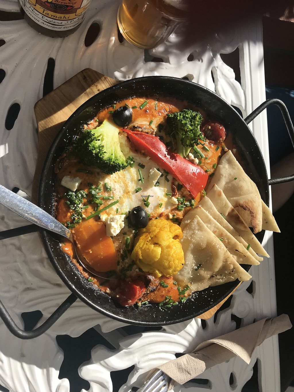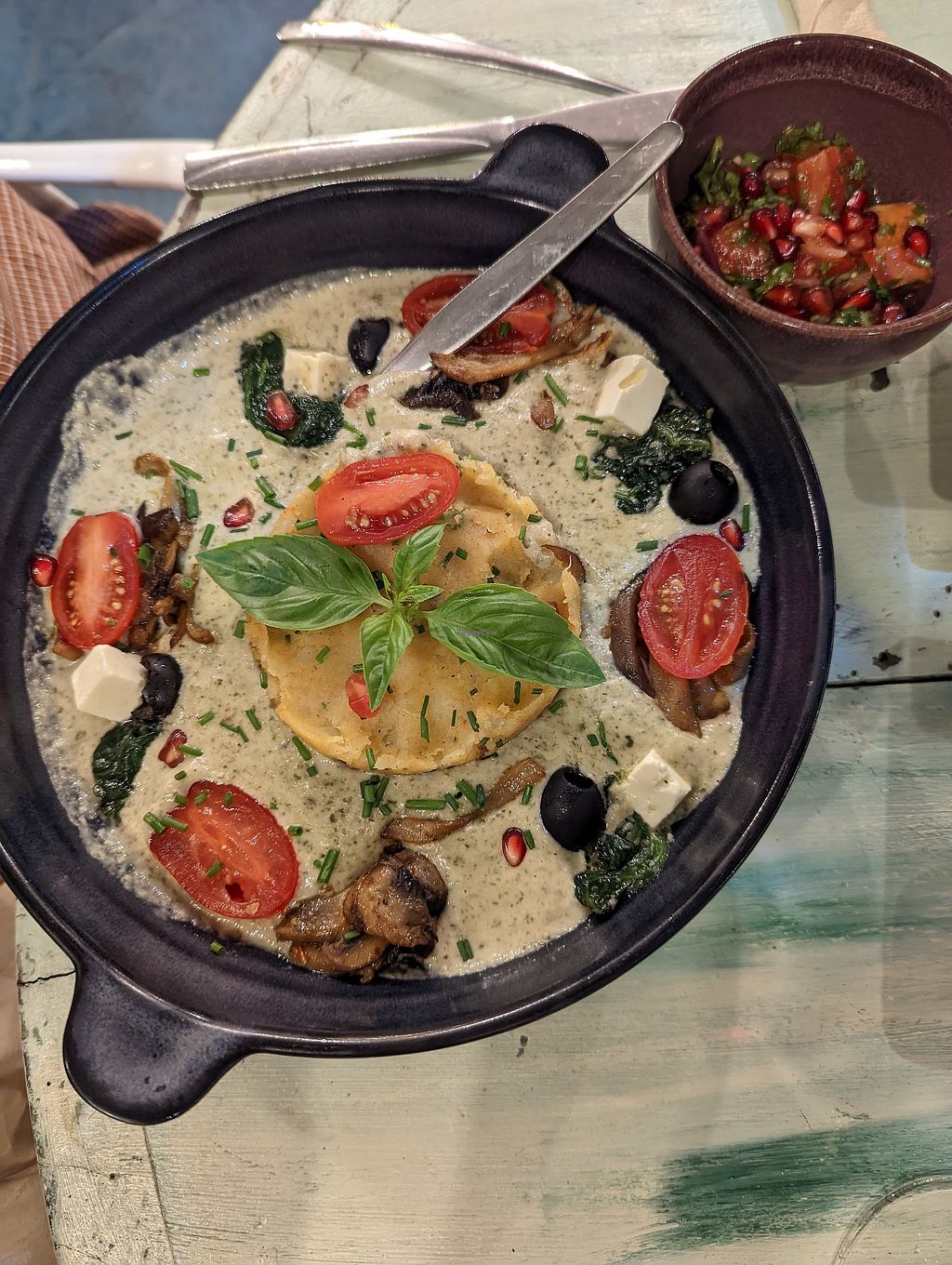 The warm mushroom stew (vegetarian) was "stunning." The yellow curry was mild with nicely cooked vegetables and topped with pleasantly surprising pomegranate arils (vegetarian/vegan without cheese). The pesto pasta (vegetarian/vegan without cheese) topped with grilled vegetables was not especially unique and a bit oversalted but still tasty. Portions were generous. The house red wine was average. The fresh juices were delicious and everything was plated beautifully. They even had a basket of fluffy blankets for dining outside on the cooler weather!