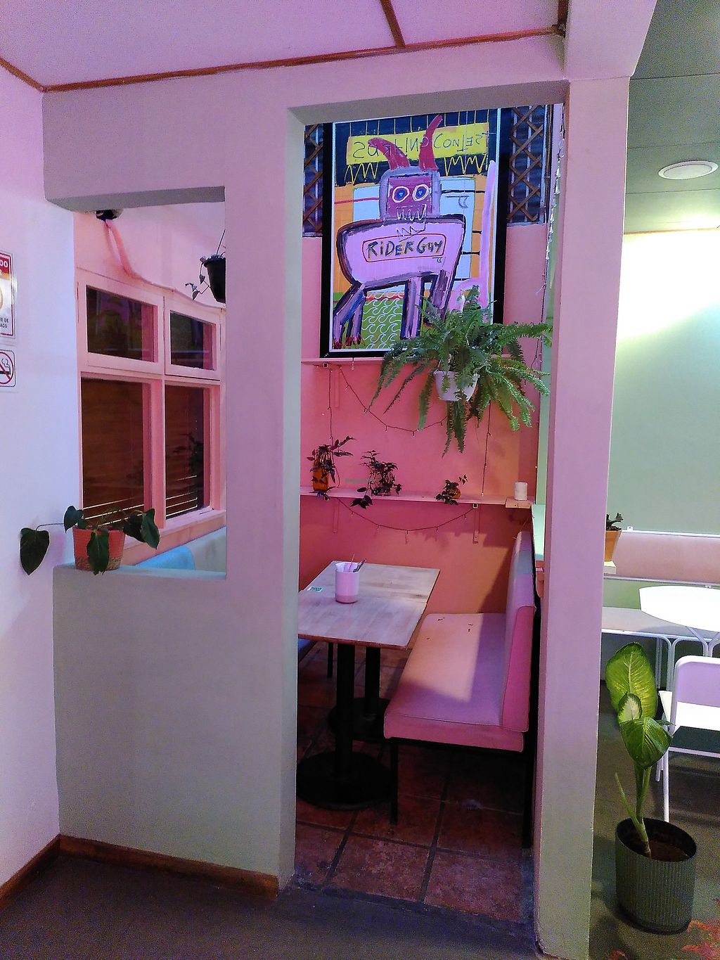 Little cafe with painting on its walls and hosts occasional live music events. Serves vegan empanadas, pizzas, taco arepas, enchiladas, burgers and fries, soups, salads, sweets, drinks. Est. 2017 on Avenida de La Cultura; moved here 2021. Open Mon-Thu 12:00pm-9:00pm, Fri-Sat 12:00pm-10:00pm.