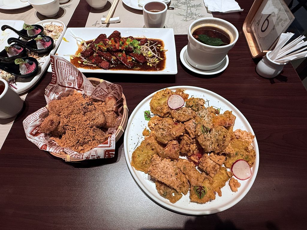 金沙彩蔬(蛋奶素)、避風塘蘿蔔糕、百香鳳梨蝦球佐綜合堅果是這次所點的料理裡面我最愛吃的,我認為有米其林水準。其他菜色也非常美味好吃,我會期待再去吃其他未曾吃到的菜色,價錢也很合理,非常推薦