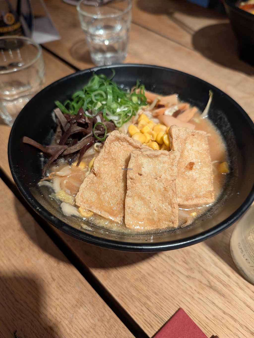 Serves meat, vegan options available. Japanese ramen restaurant offering vegan choices including a vegan ramen with tofu & vegetables, gyoza and edamame. Open Mon 13:00-21:30, Wed-Sun 13:00-21:30.