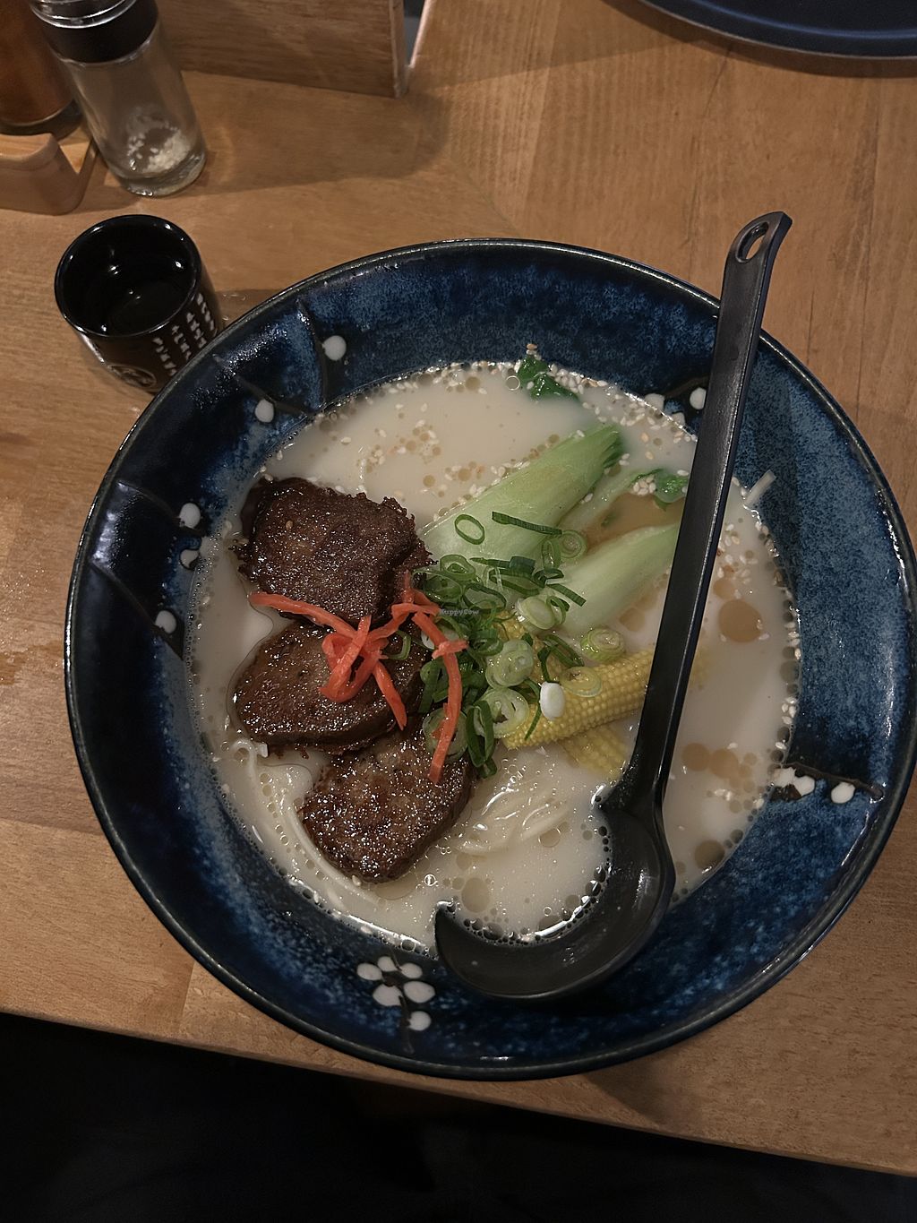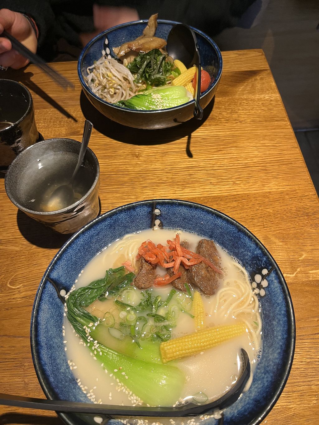 Read moreTonkotsu ramen - lots garlic flavour in there broth and a good bit of creaminess but lacked a bit of body. I added a bit of chilli oil and that did help bring everything together better. The beef had a good texture and searing but could have done with some more seasoning. The other vegetable toppings were not very exciting: pak choi, corn and tomatoes